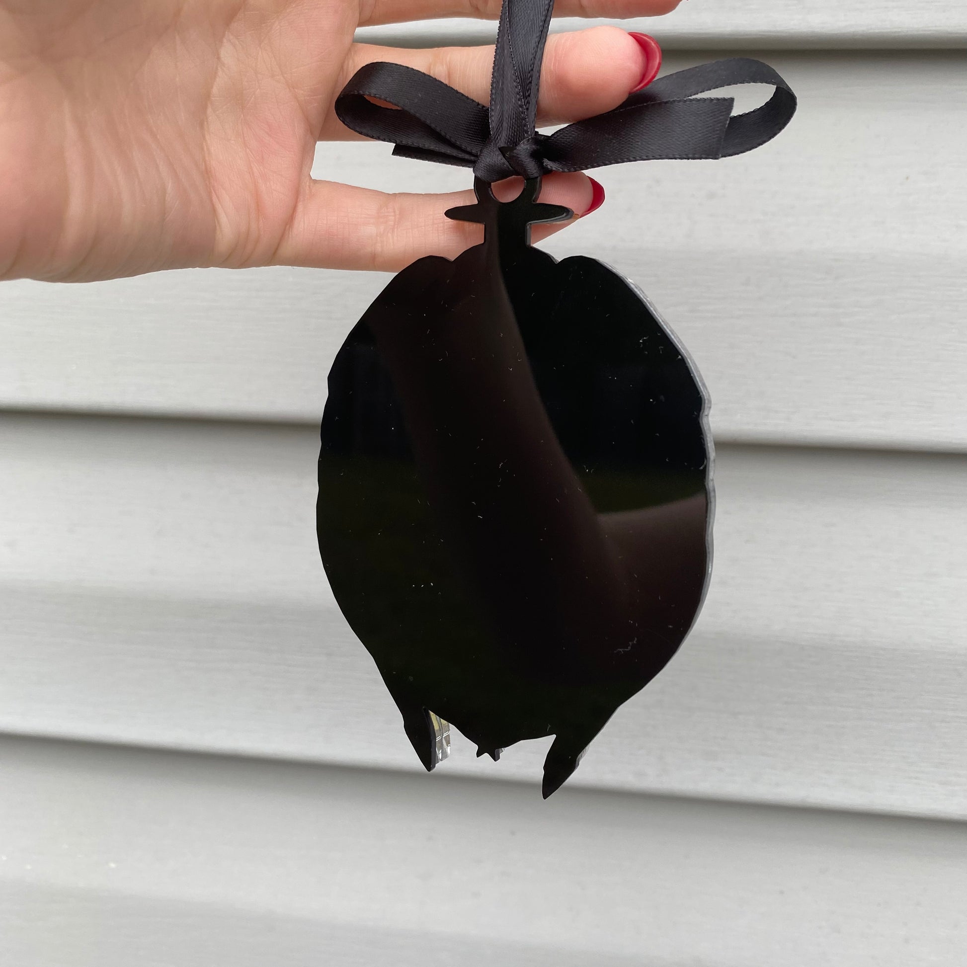 The first of many ornaments, this one is about 4.5” tall and hangs from a black ribbon with a bow! The ribbon is about 3” long- Ready for easy hanging!!