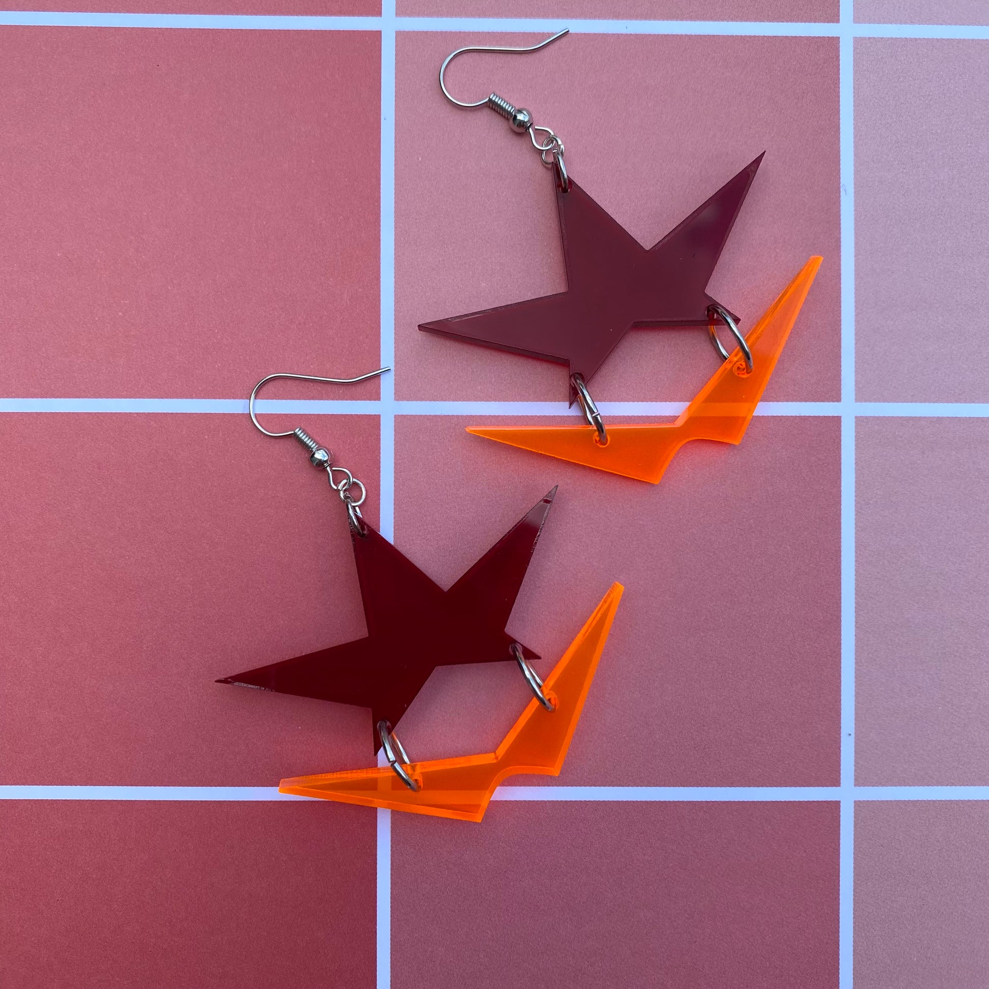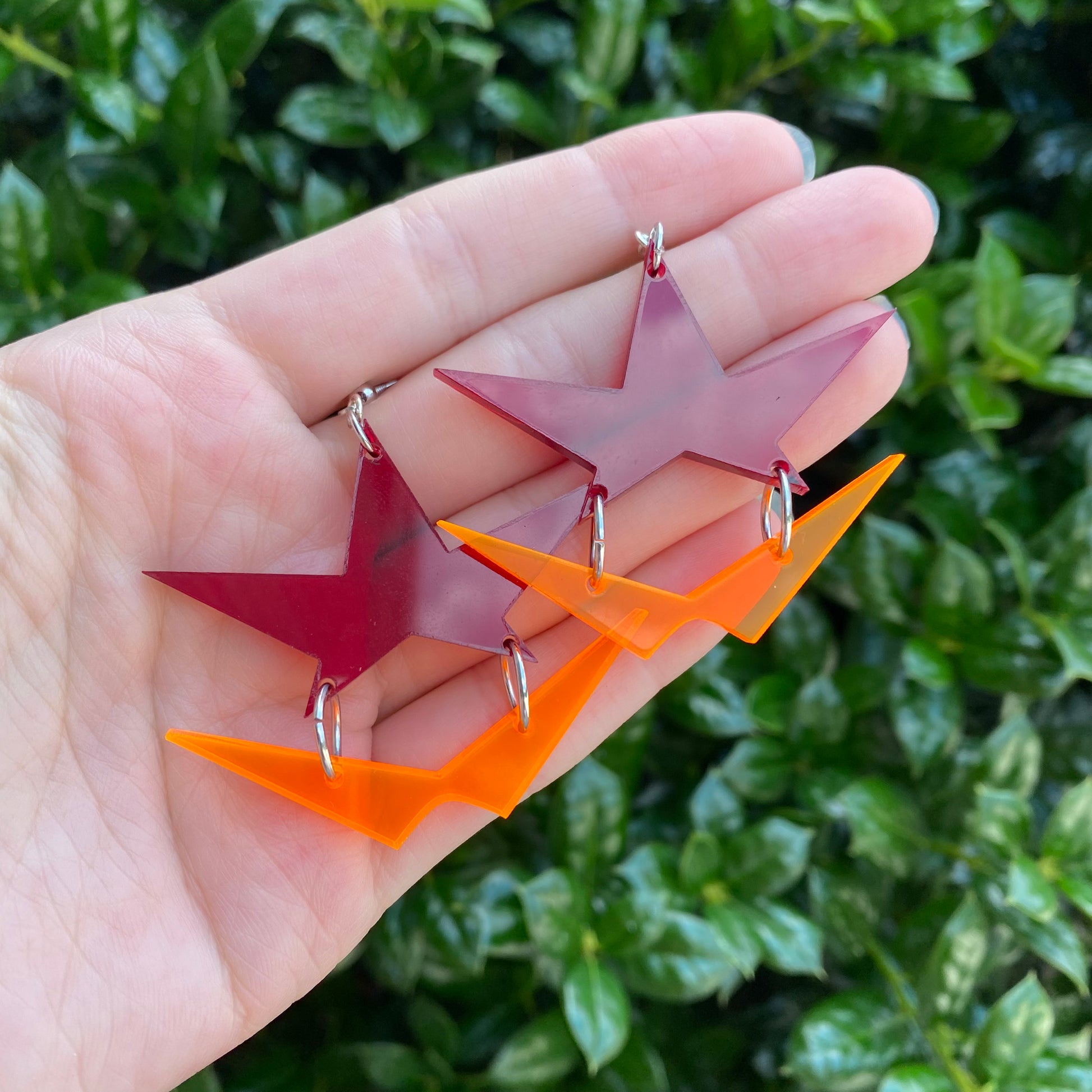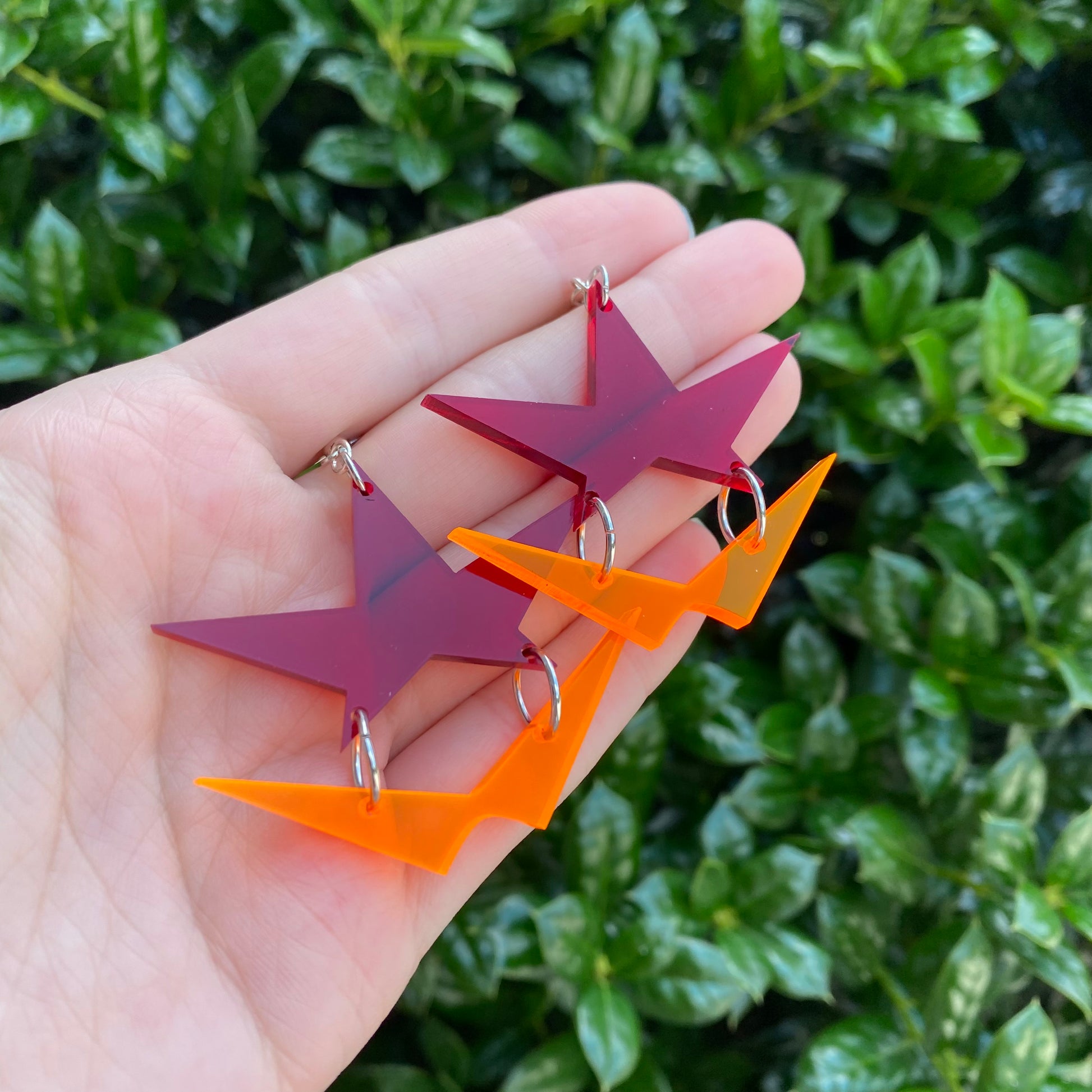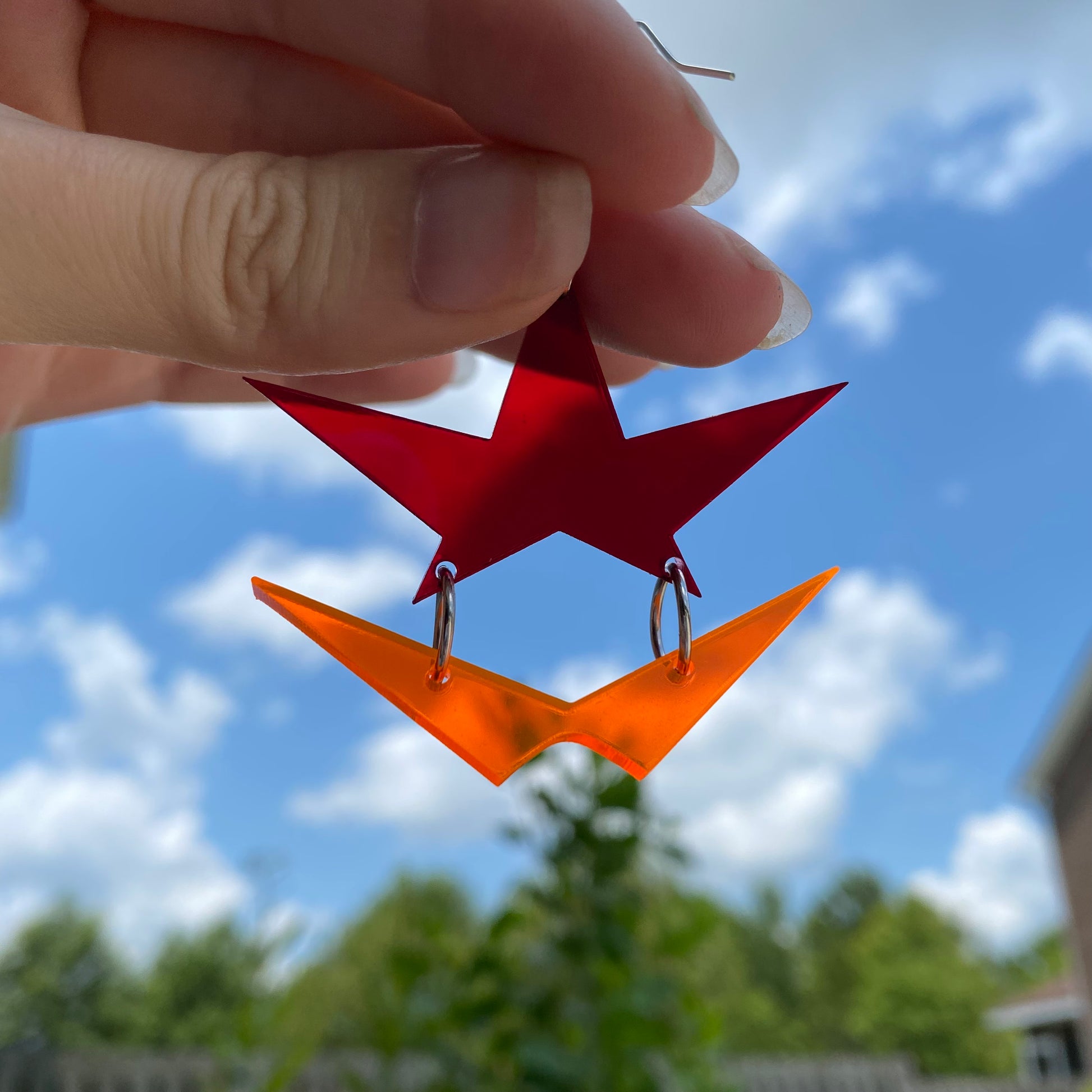 The earrings are about 1.5” across and 2” long- cut from transparent orange and red acrylics!