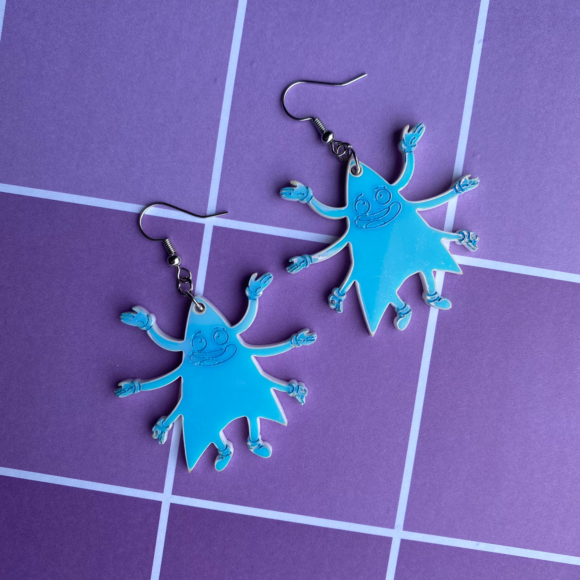 These earrings are cut from a special blue iridescent acrylic- it changes in different lighting from a bright blue, rainbow, and white!