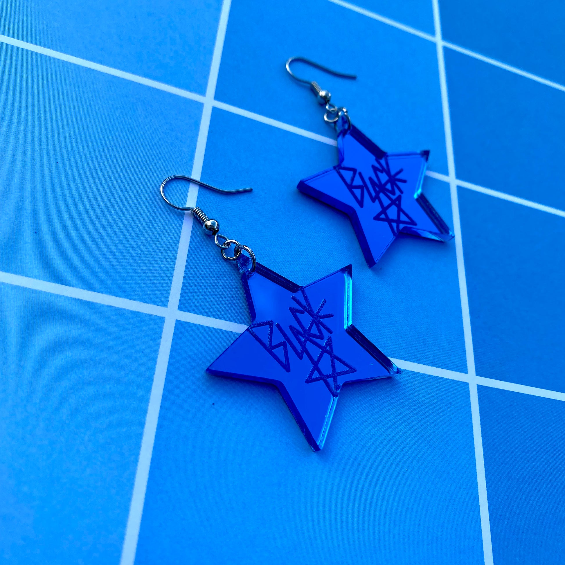 The earrings are 1.5” long and cut from my own laser! The earrings are etched from mirror backed acrylic, meaning the front is shiny and the back is a light grey color!