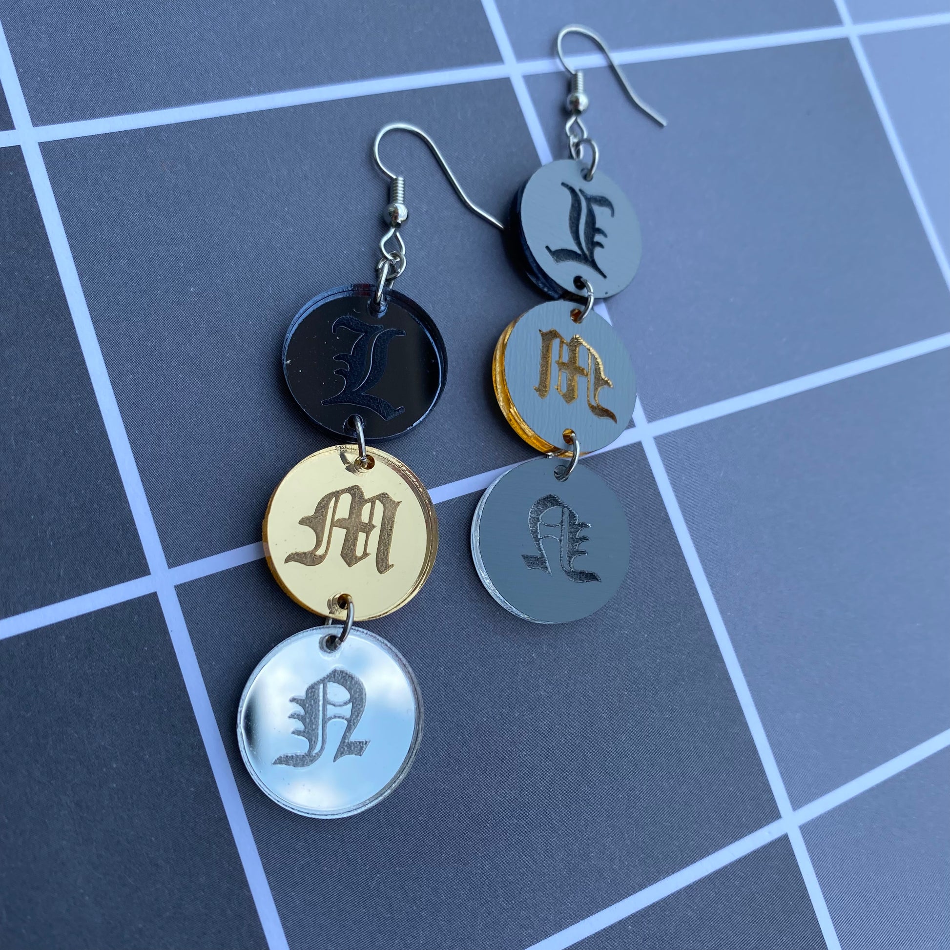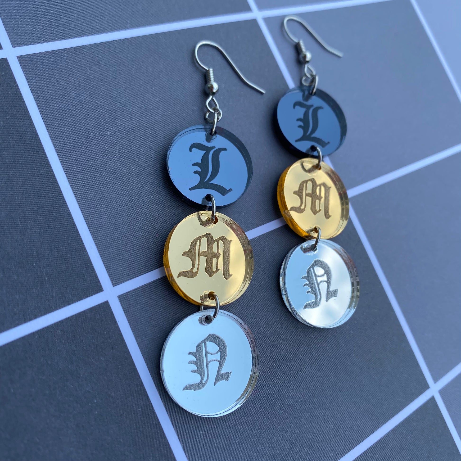 Chain of Letters L, M, N Mirrored Acrylic Earrings