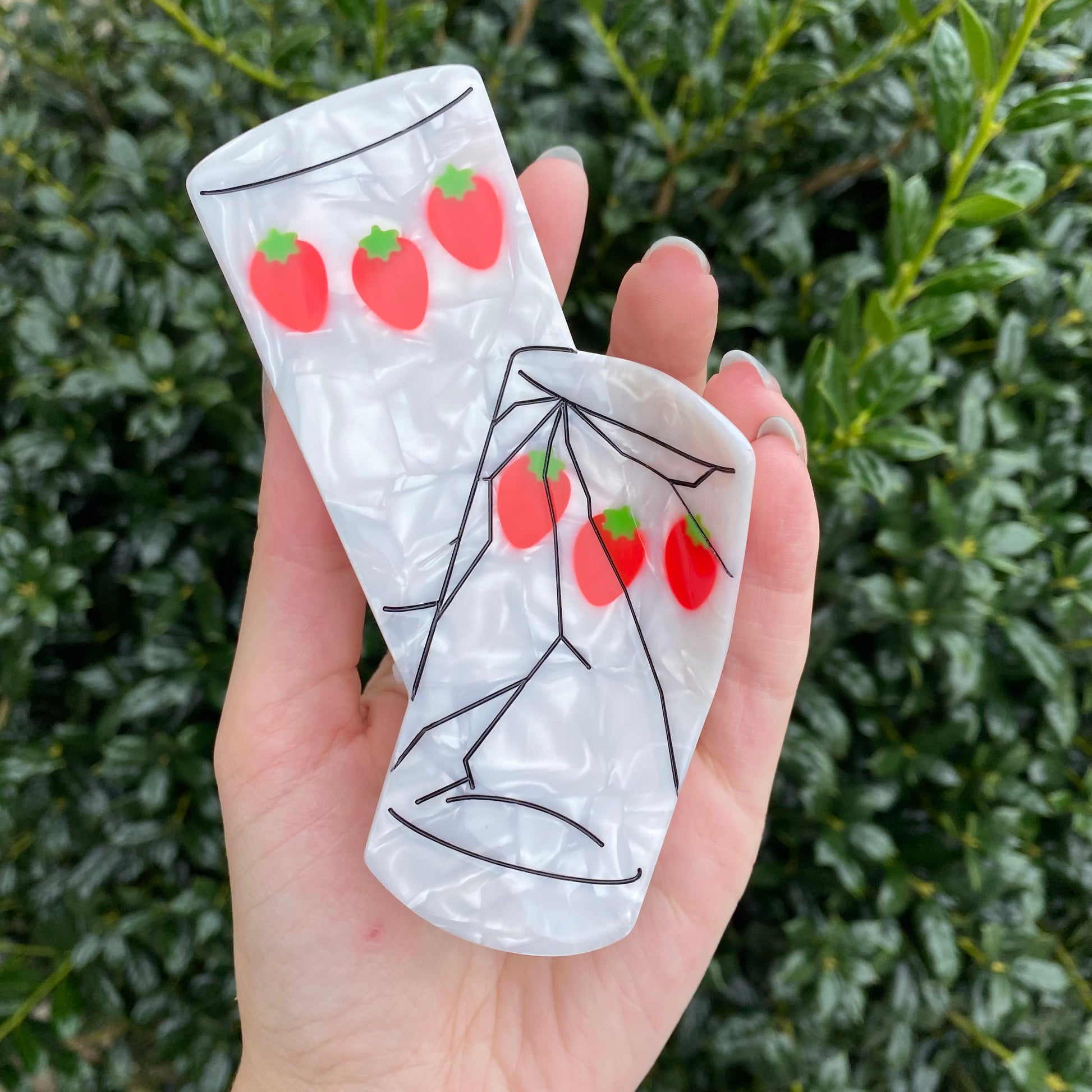 Made from durable acetate acrylic with the design being directly spliced into the clip!! The cracked lines are engraved and the strawberries are spliced into the base!