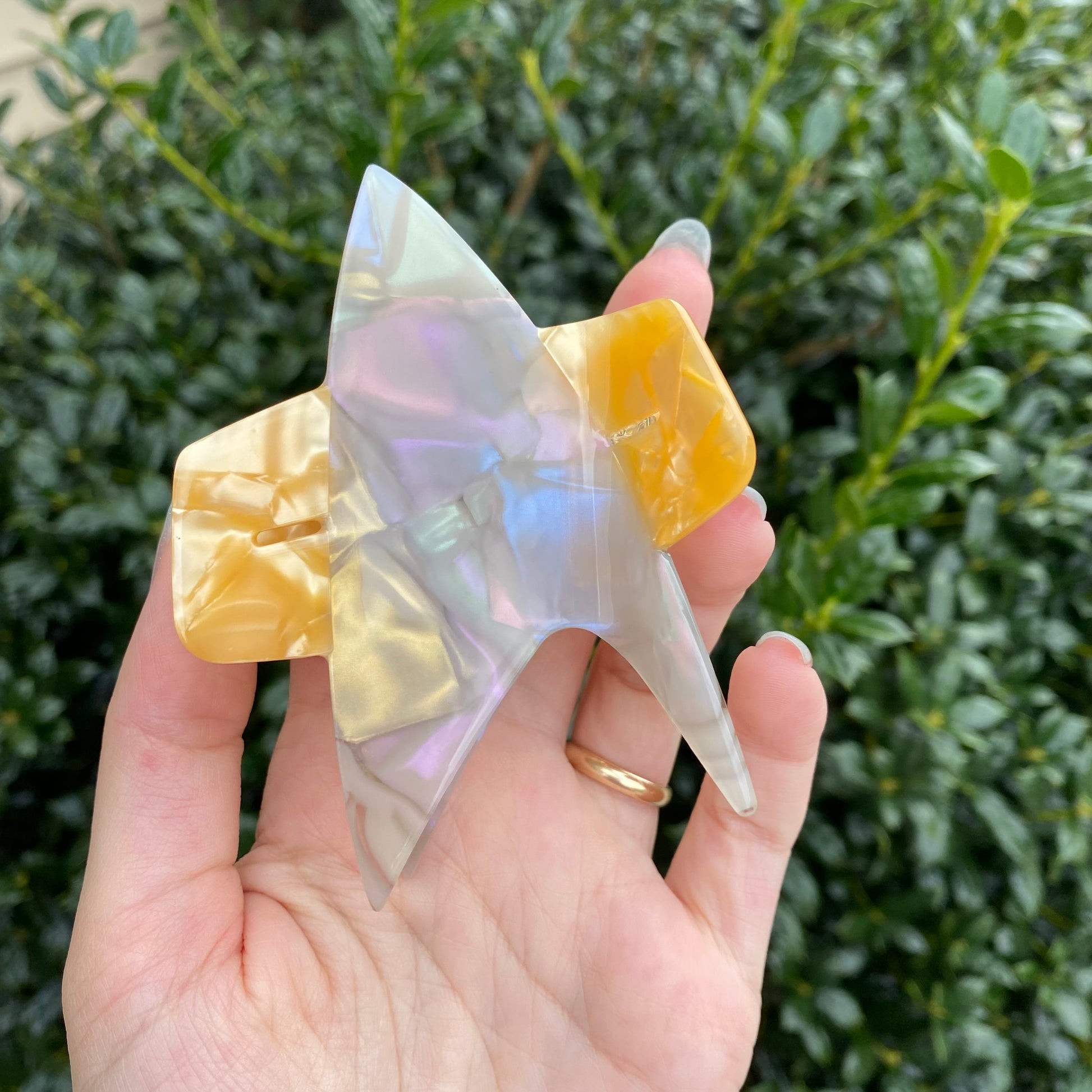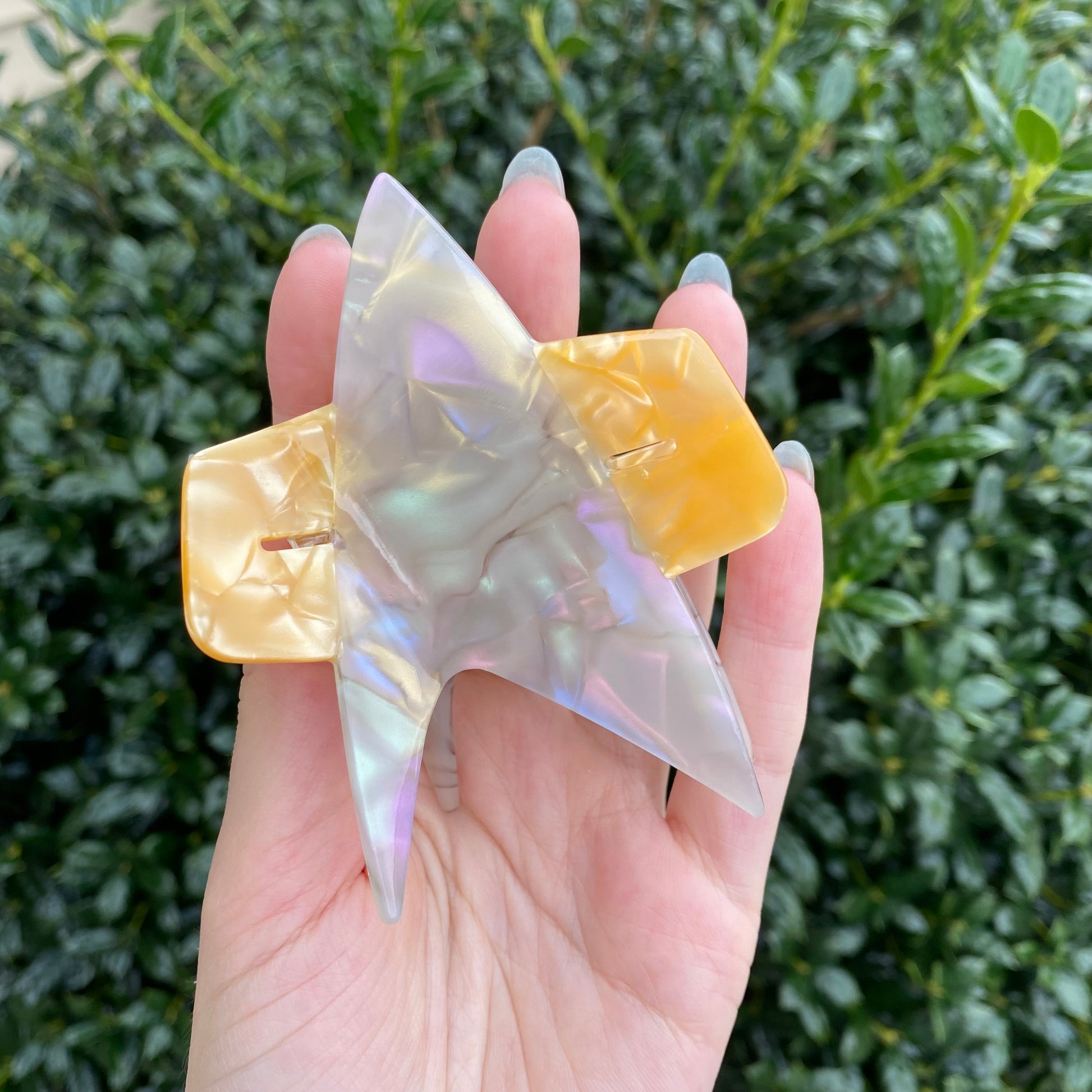 Next up is the DS9/VOY claw clip!! This clip features both a shiny gold, and an iridescent silver!! When the silver catches the light, it shows off a faint pastel rainbow within the acetate!