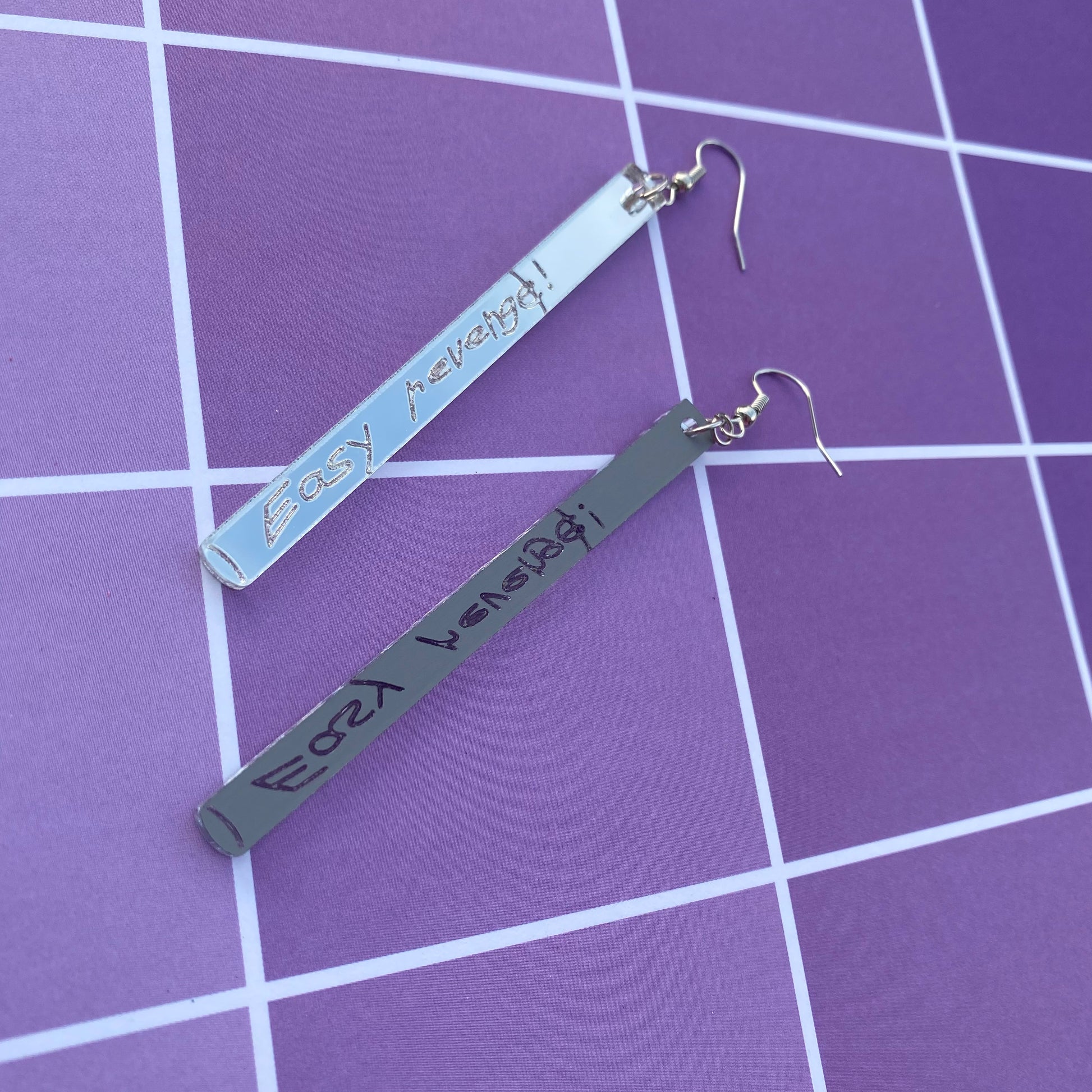 The earrings are 3” long and cut from my own laser! The earrings are etched from mirror backed acrylic, meaning the front is shiny and the back is a light grey color!