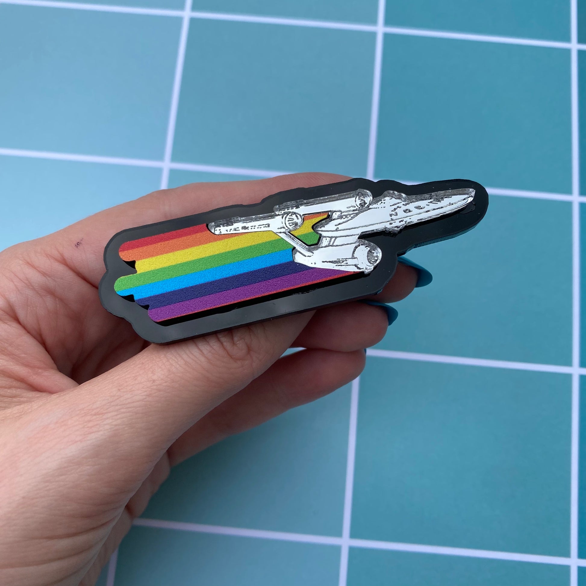 This pin features unique printed rainbow, a shiny silver Enterprise, all adhered on a sleek black acrylic base!