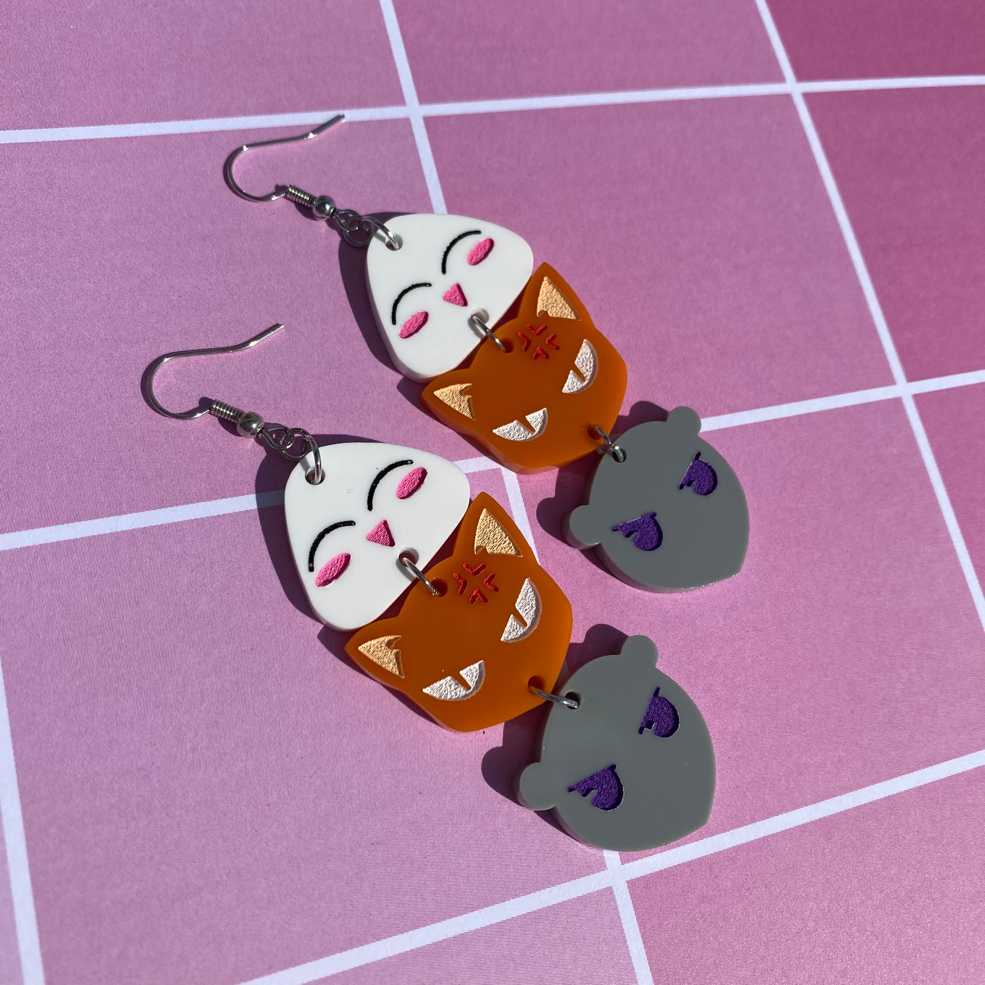 Each character charm is 1” tall, and the entire earring is about 3” long.