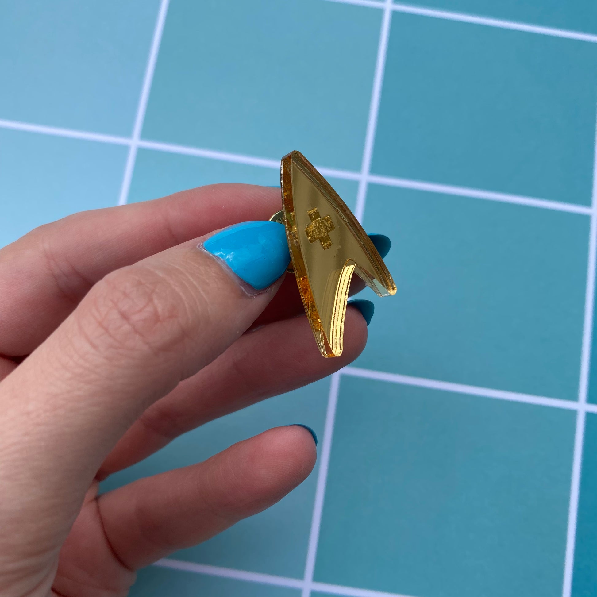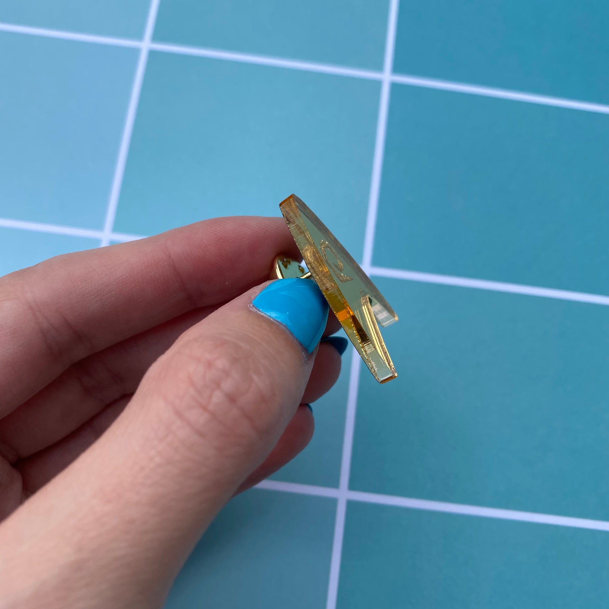 Each pin is cut and etched from my own laser from lightweight mirrored acrylic! The front side has the gold mirror and the back is a light grey color