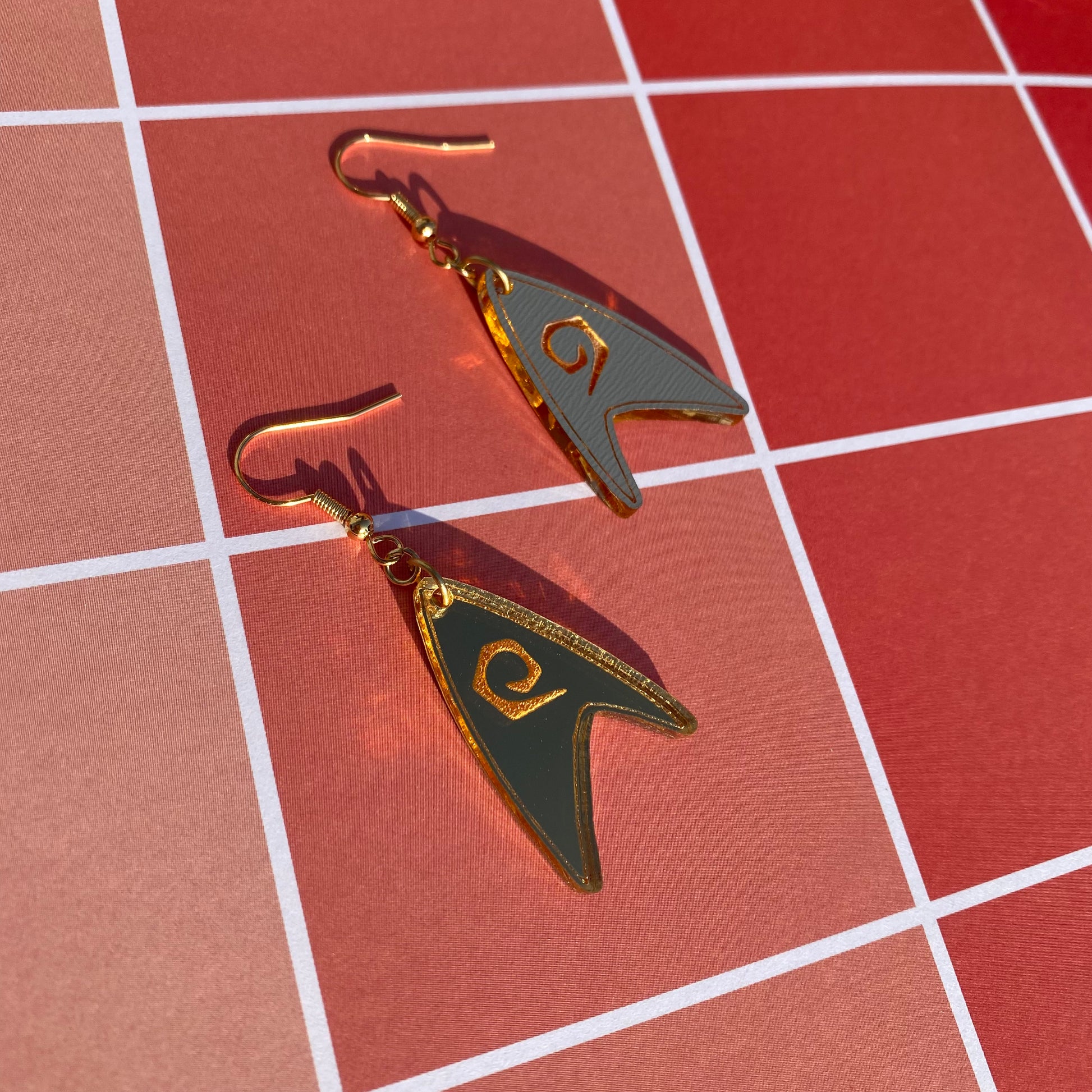 The earrings are 1.2” long and cut from my own laser! The earrings are etched from mirror backed acrylic, meaning the front is shiny and the back is a light grey color!