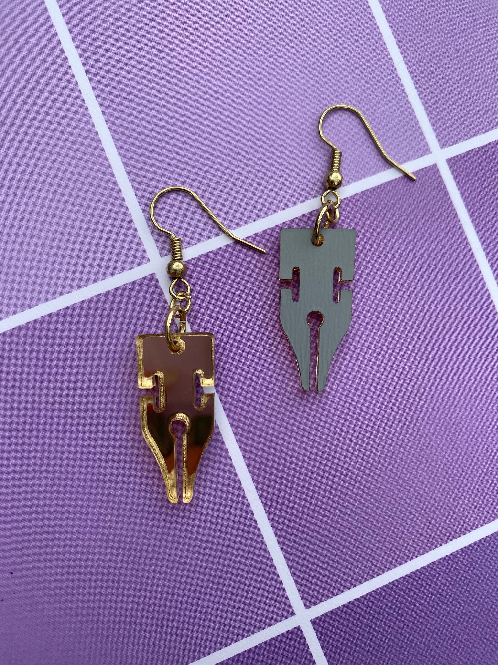 The golden pen is cut from mirror backer acrylic, so the charms are super lightweight and should not cause any strain on your ears!