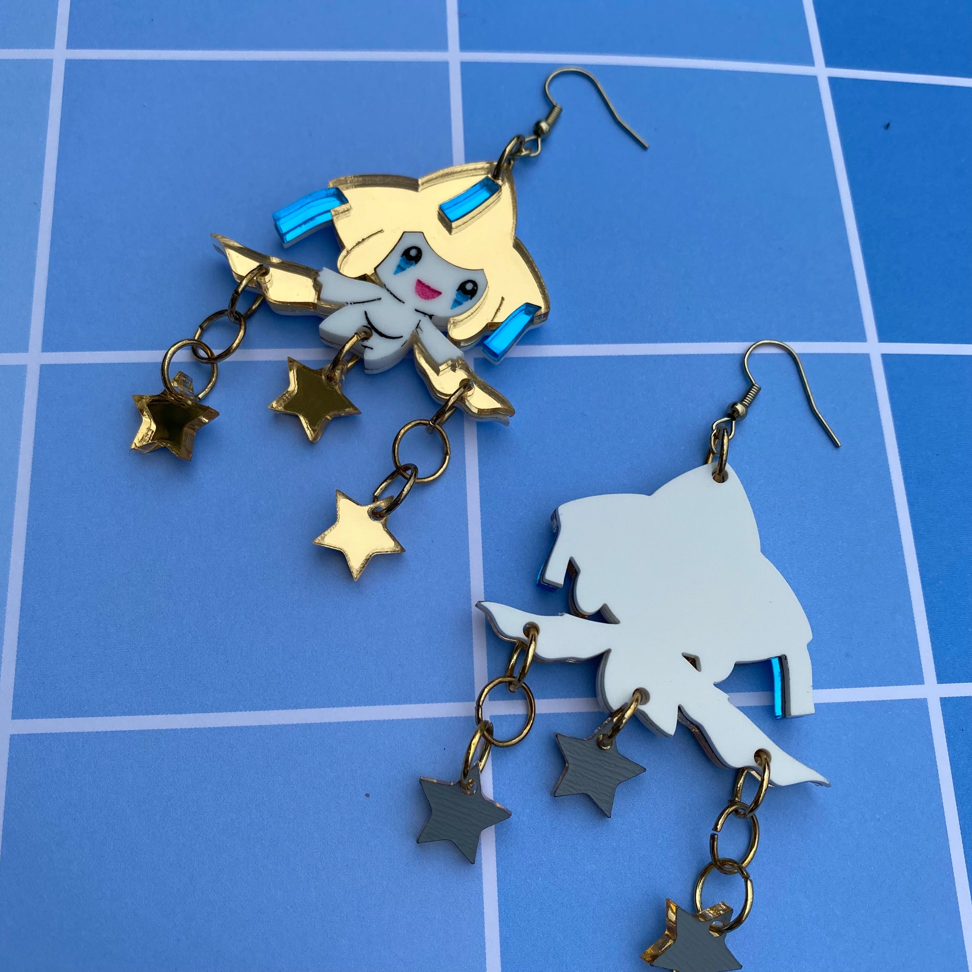 Jirachi features golden acrylic highlights and gold dangle stars!! They shine and move around when worn for that extra eyecatching element!!