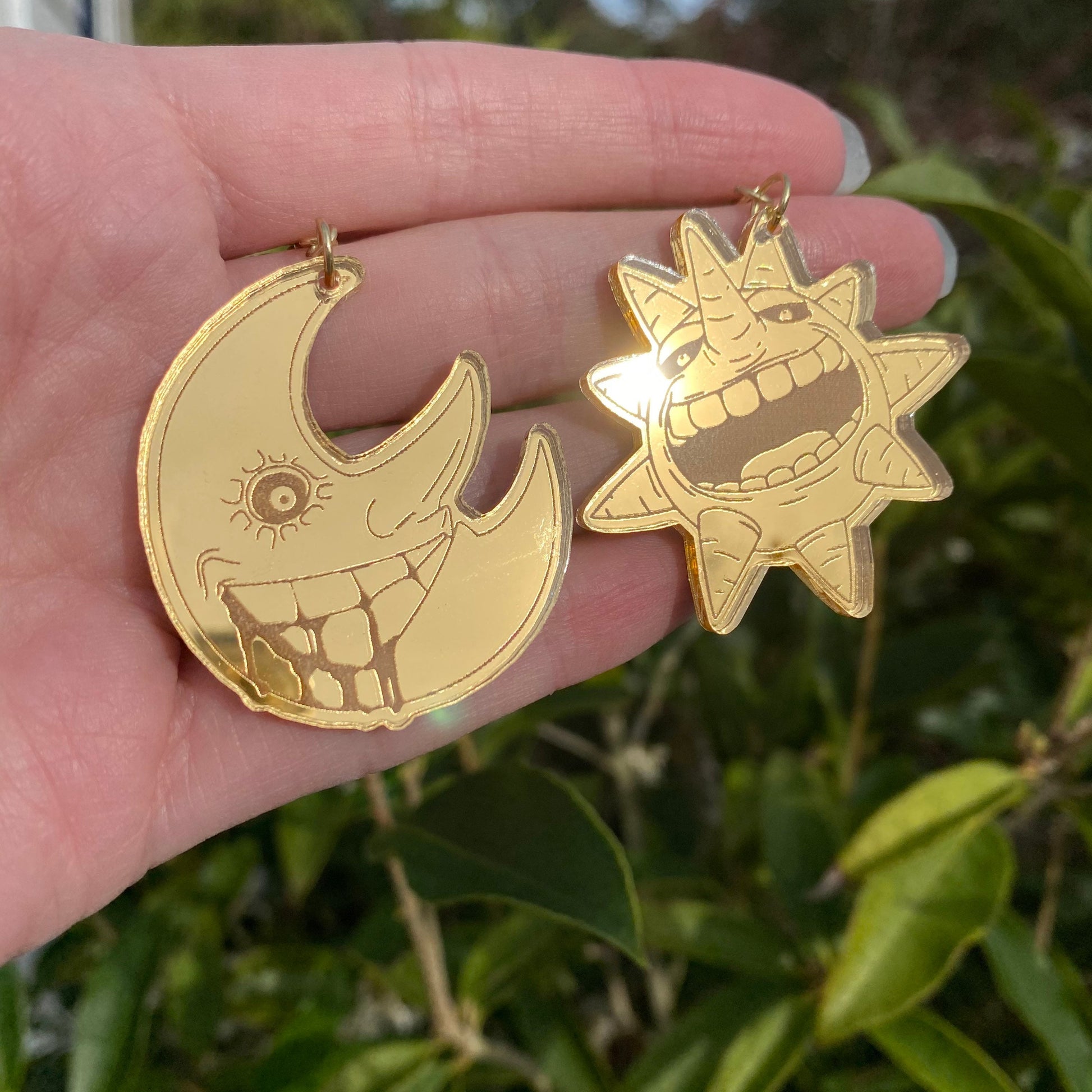 Laughing Sun and Moon Gold Mirrored Acrylic Earrings