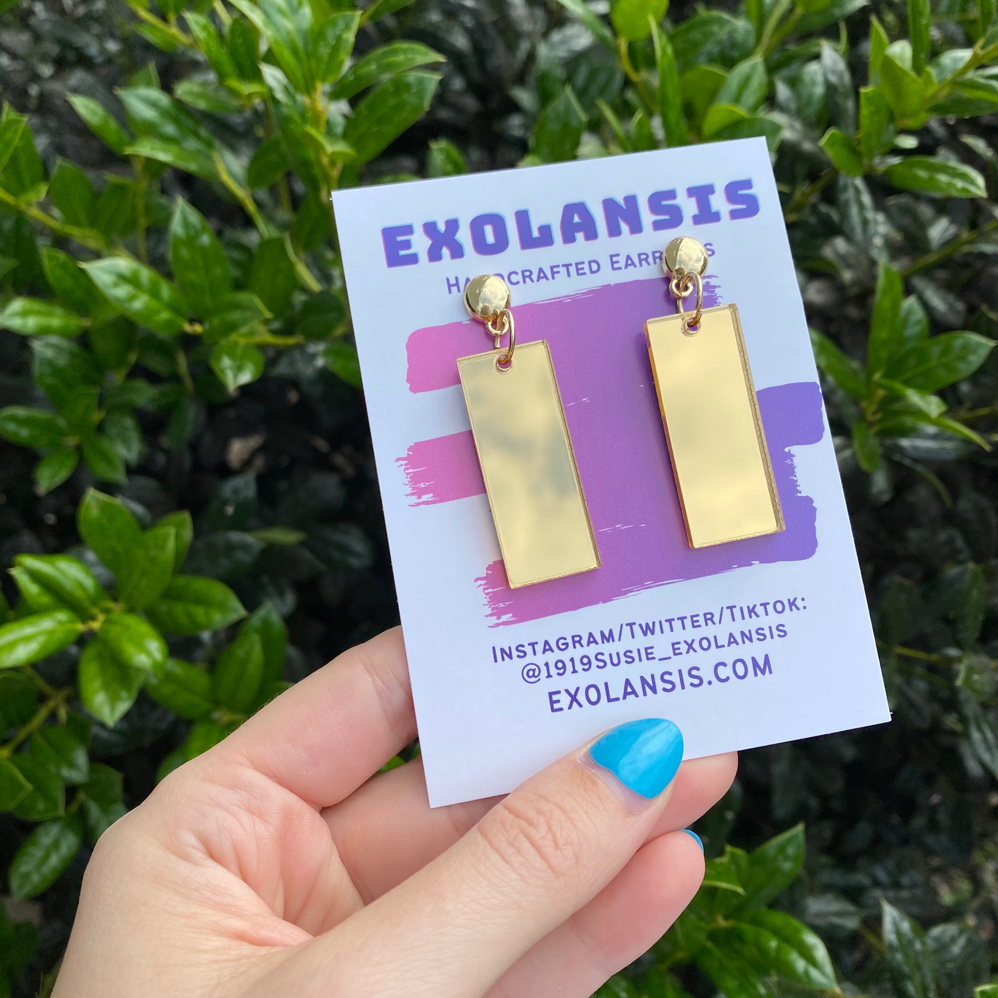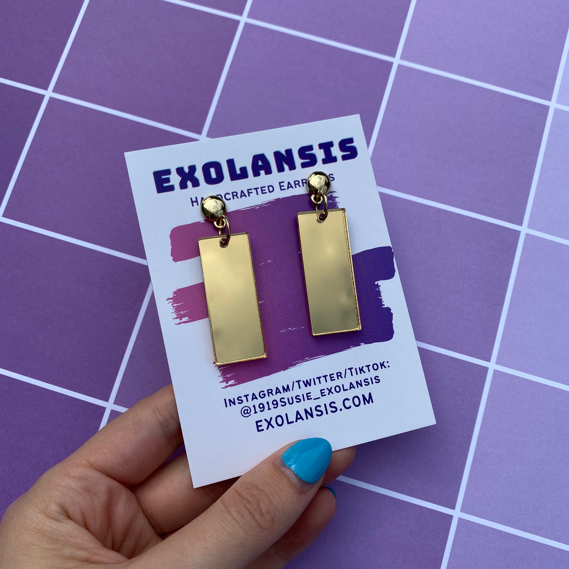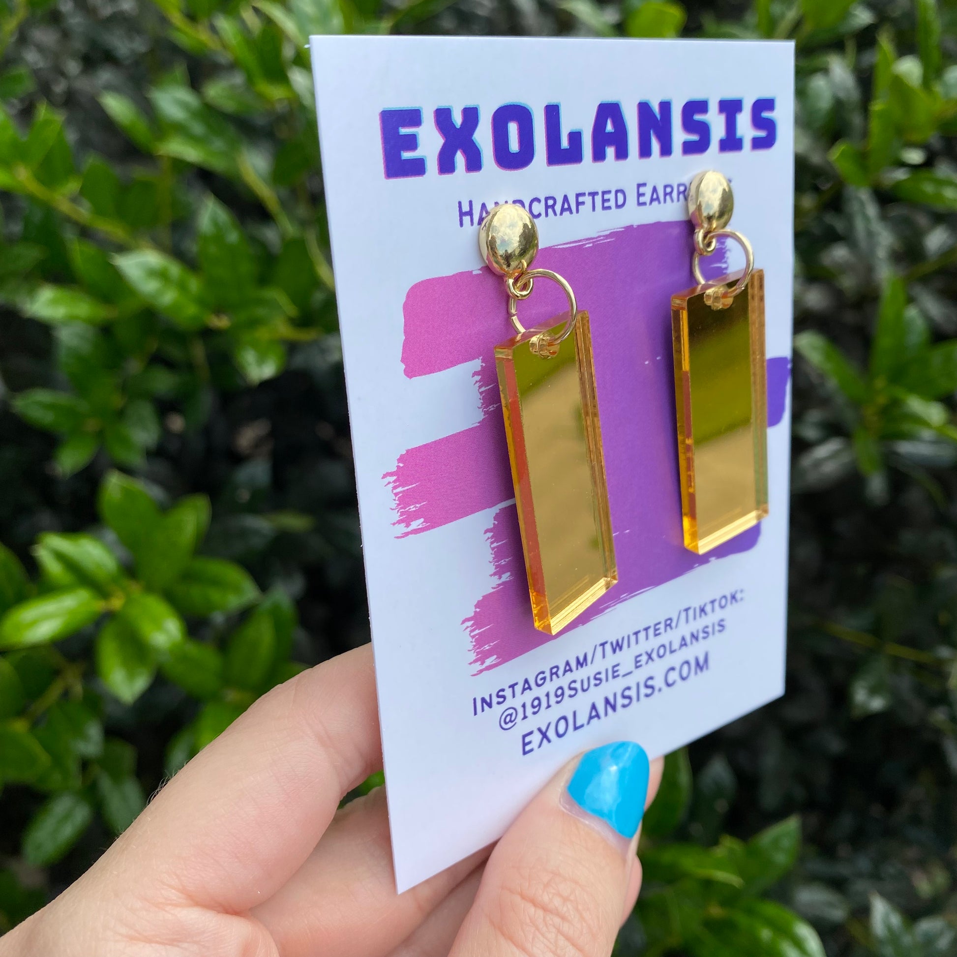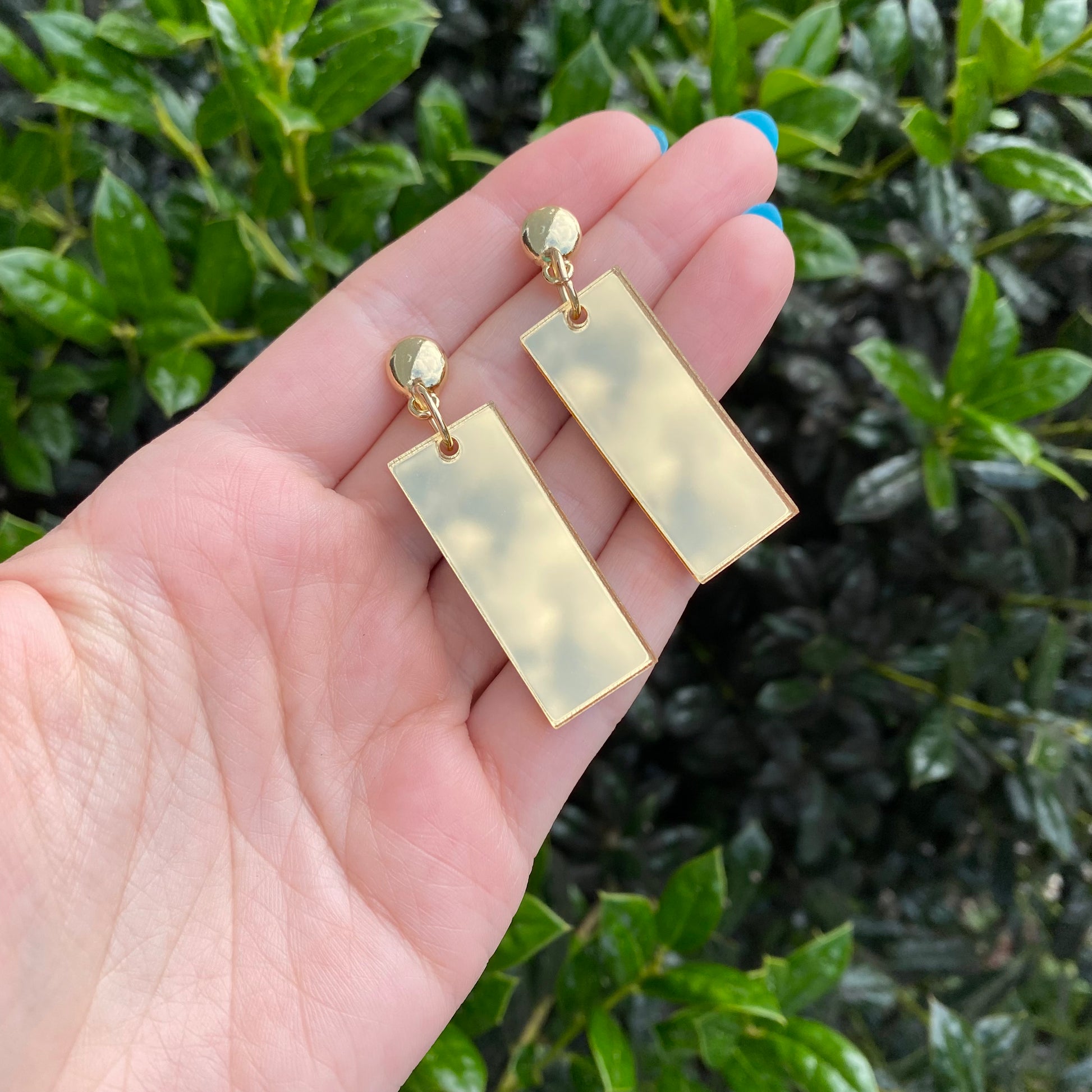 The earrings are 1.5” long and cut from my own laser! The earrings are cut from mirror backed acrylic, meaning the front is shiny and the back is a light grey color!