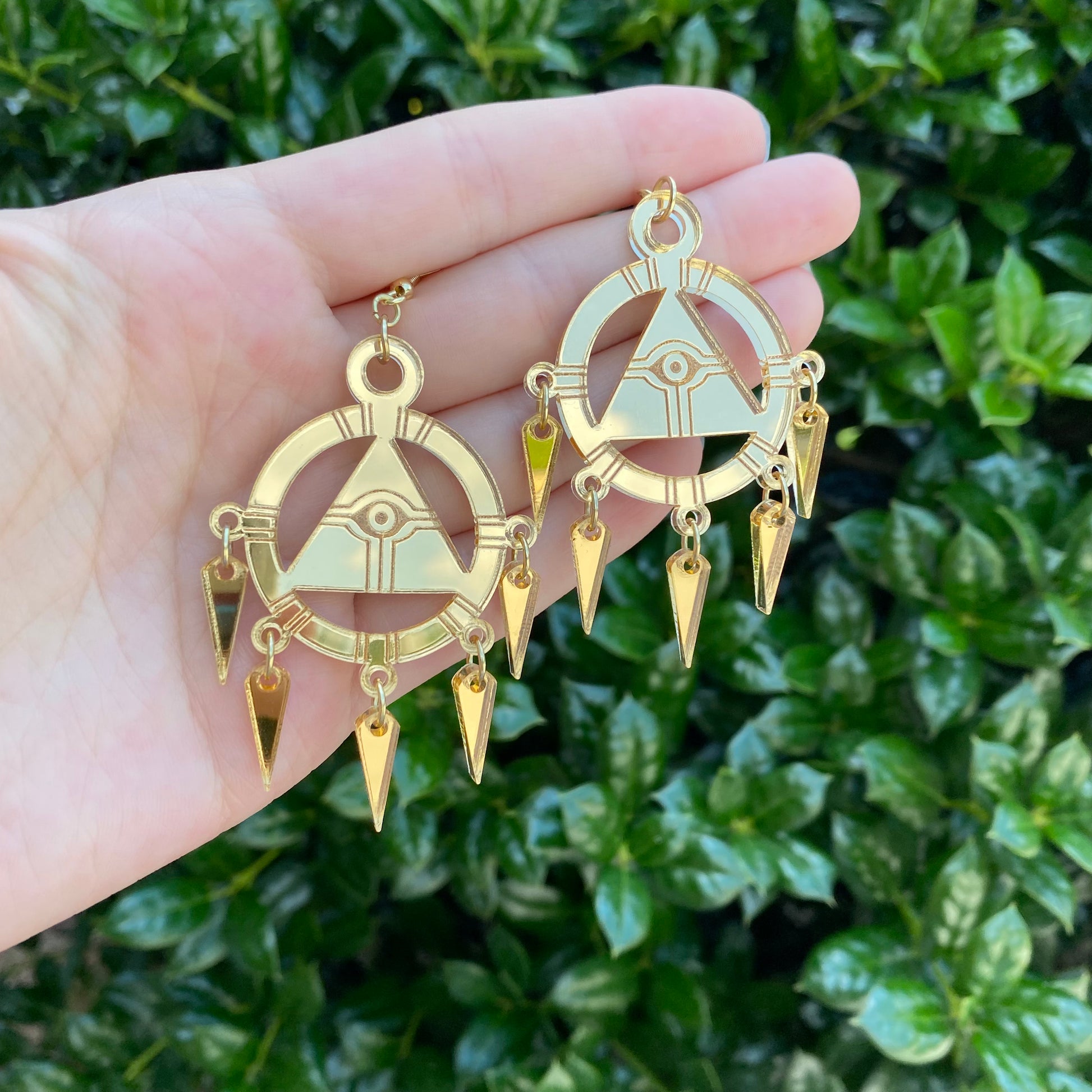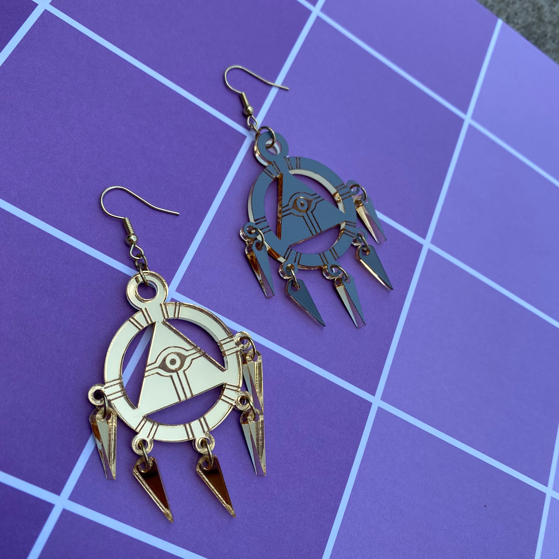 The earrings are etched and cut from my own laser!! They are cut from mirror backed acrylic, meaning the front is a reflective gold, while the back is a light grey color.