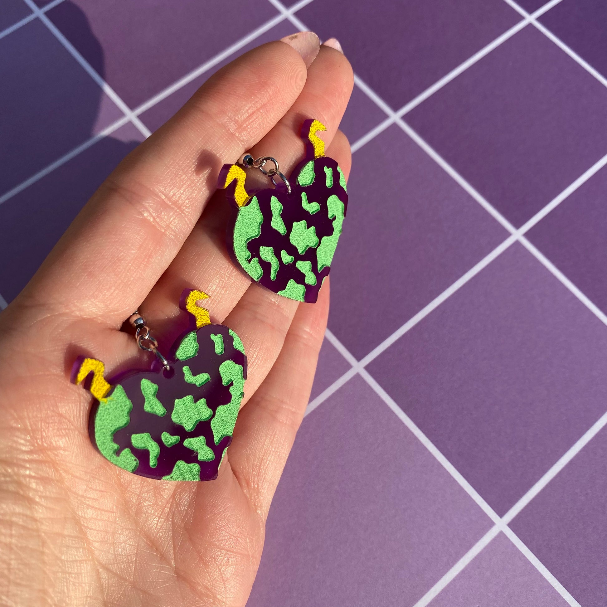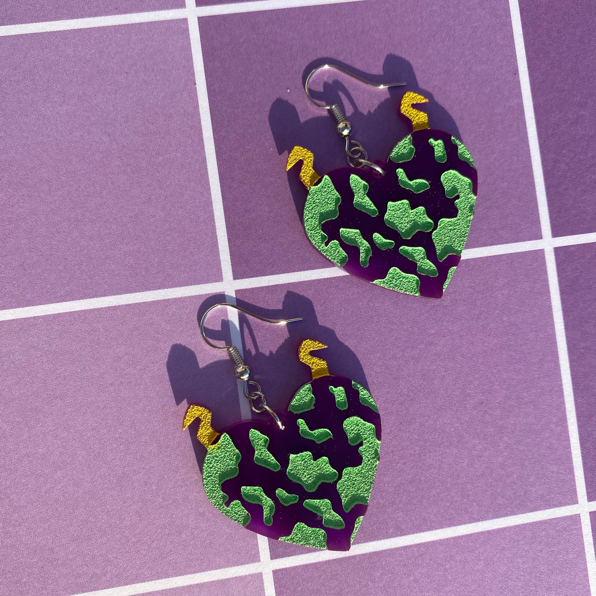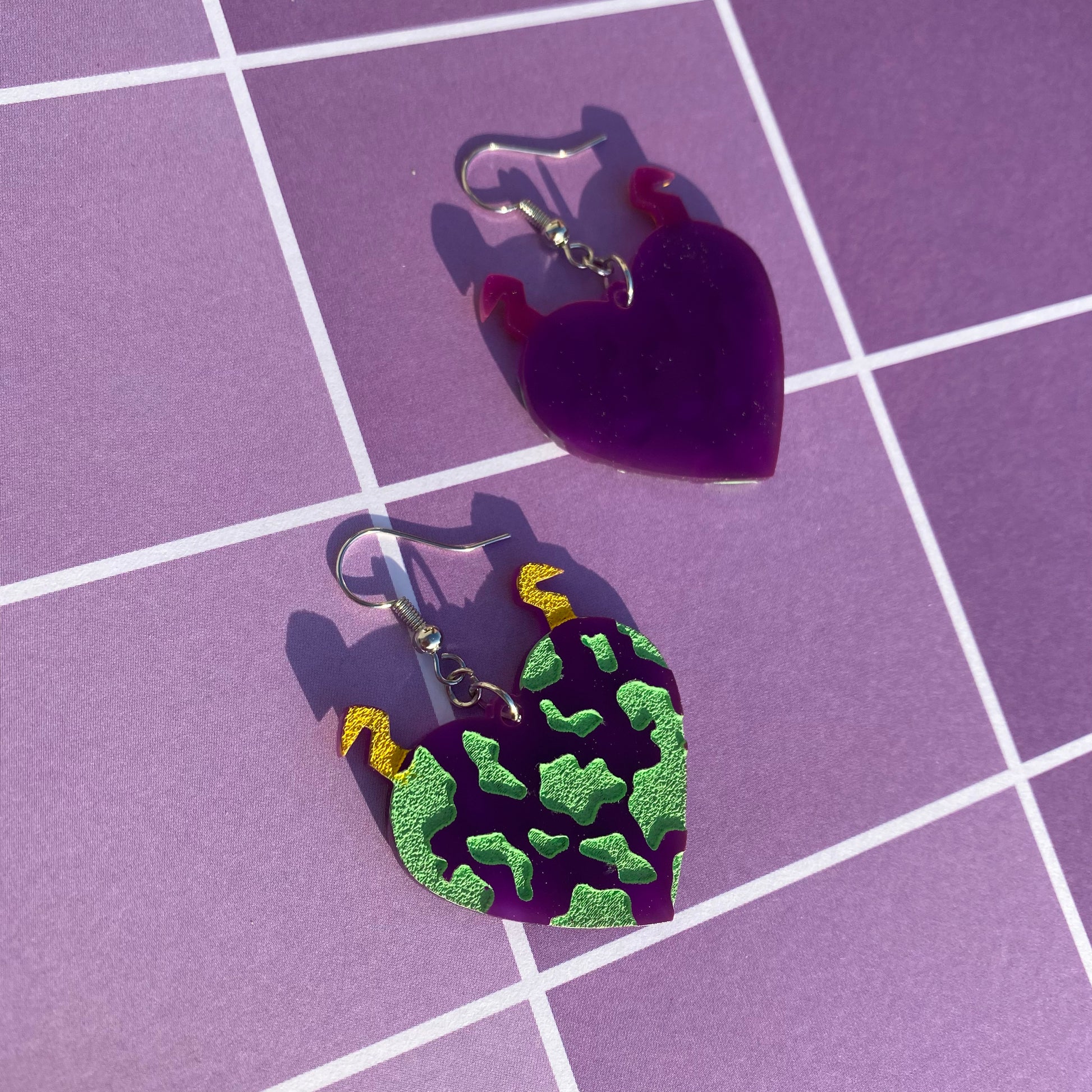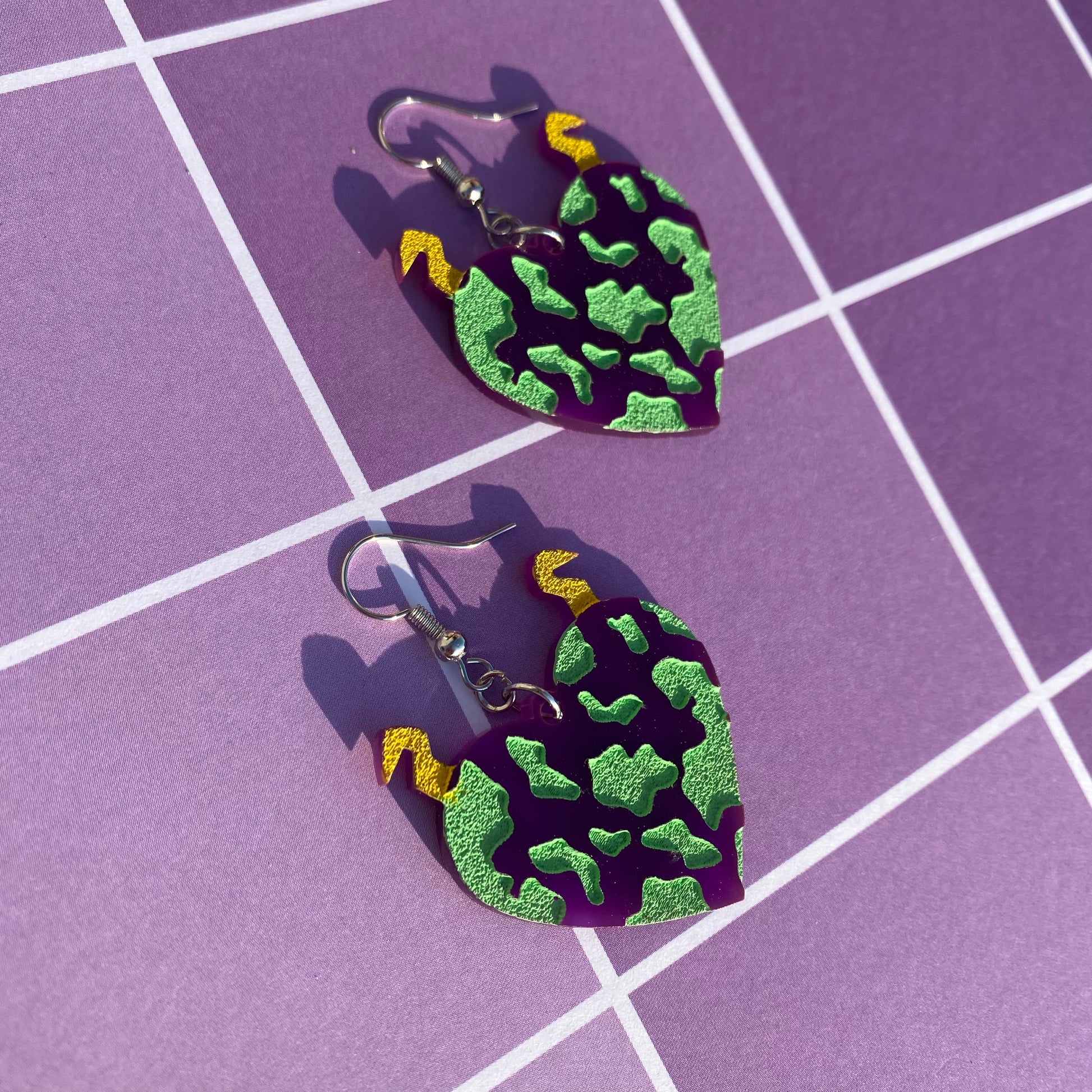 The earrings are 1.2” long- cut and etched from my own laser! The etchings are hand painted and are only on the front side of the earrings. The backs are a plain purple acrylic.