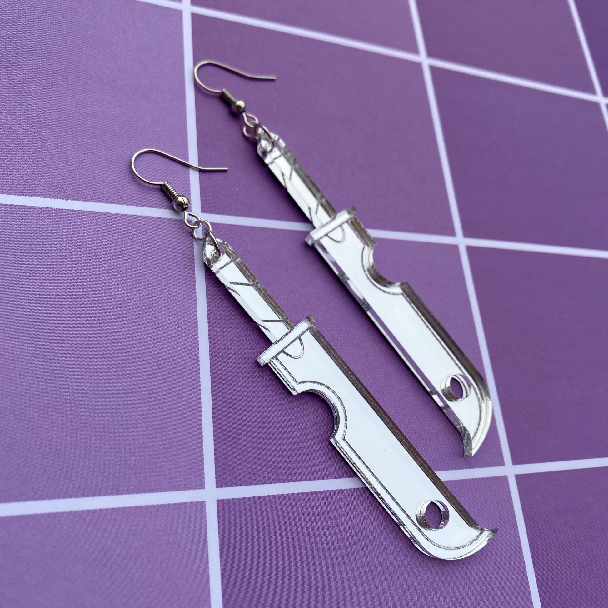 The earrings are cut and etched from my own laser out of mirror backed acrylic!