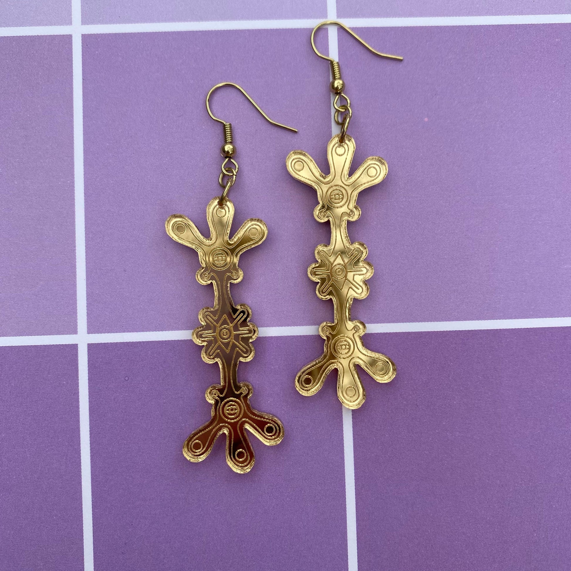 Sahaquiel is made of gold mirror acrylic, and are 2” tall on nickel-free gold hooks!