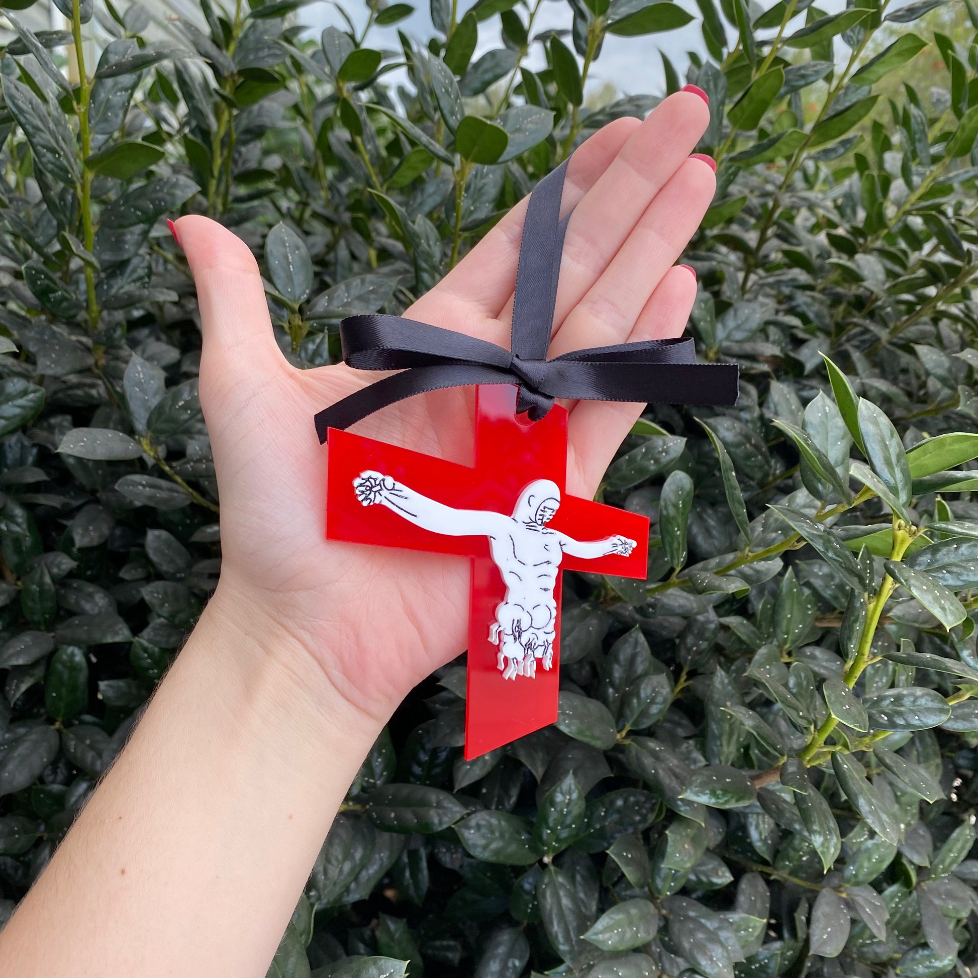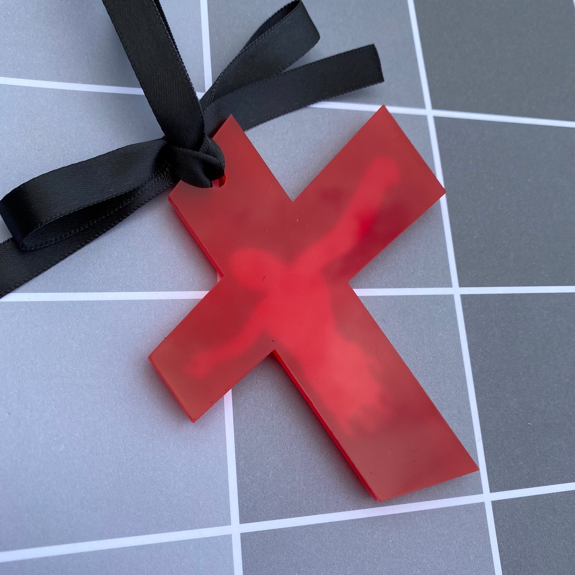 The ornament is cut and etched from my own laser! Lilith is adhered to the front of the cross, while the back is plain red acrylic!