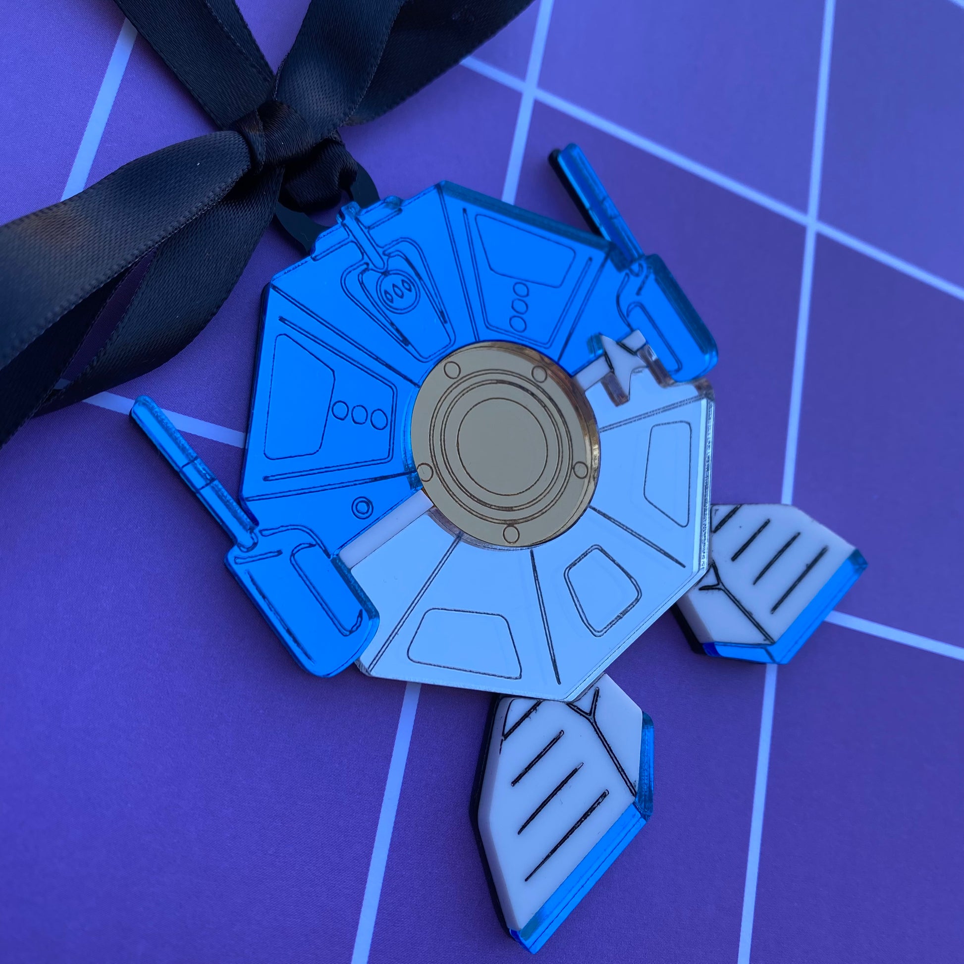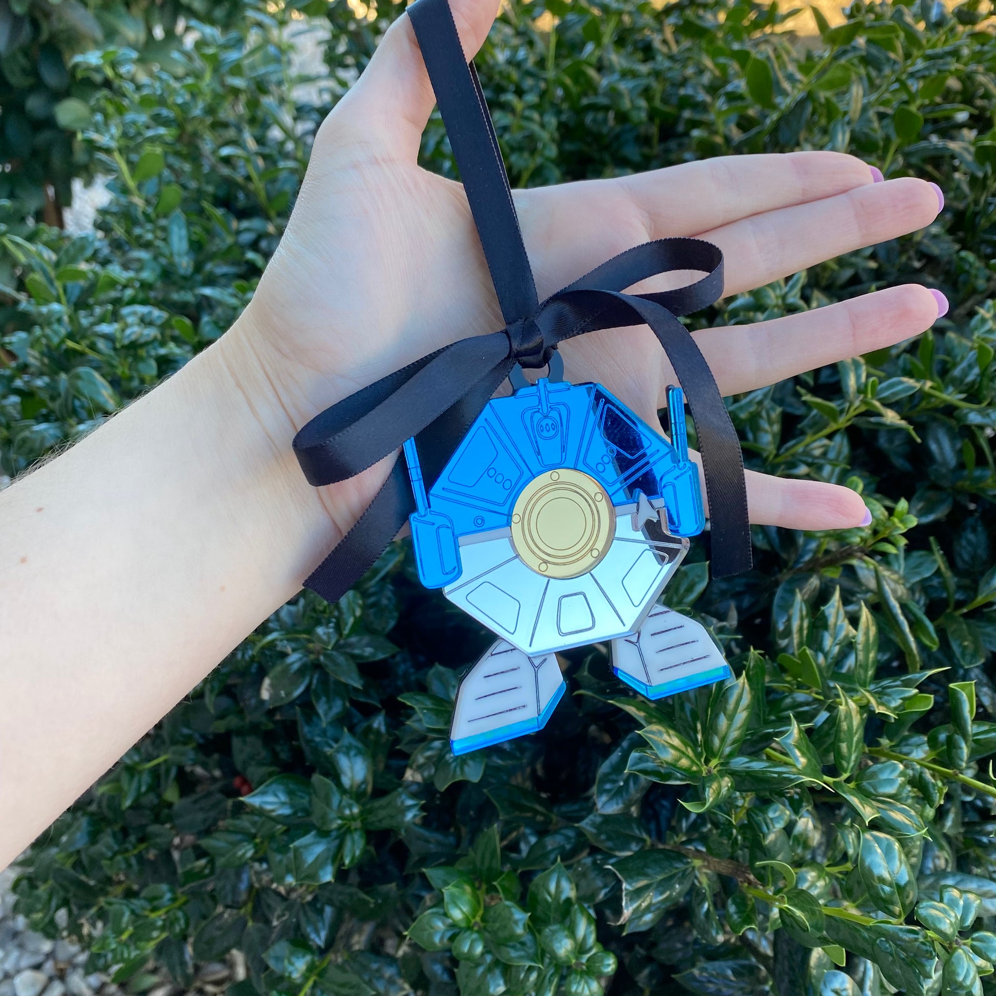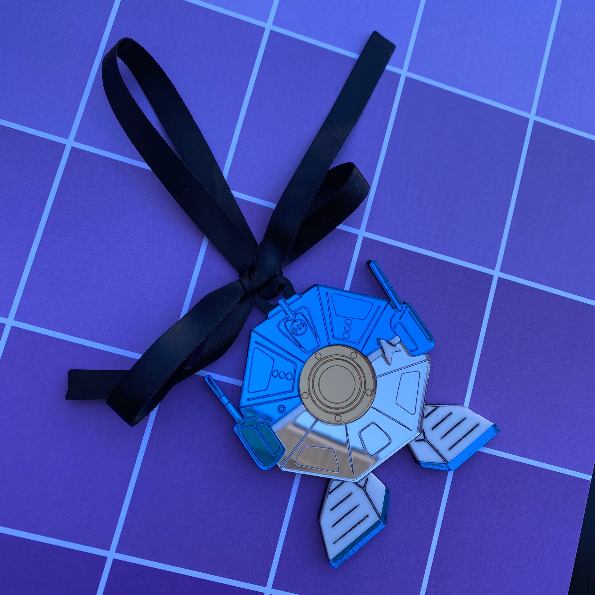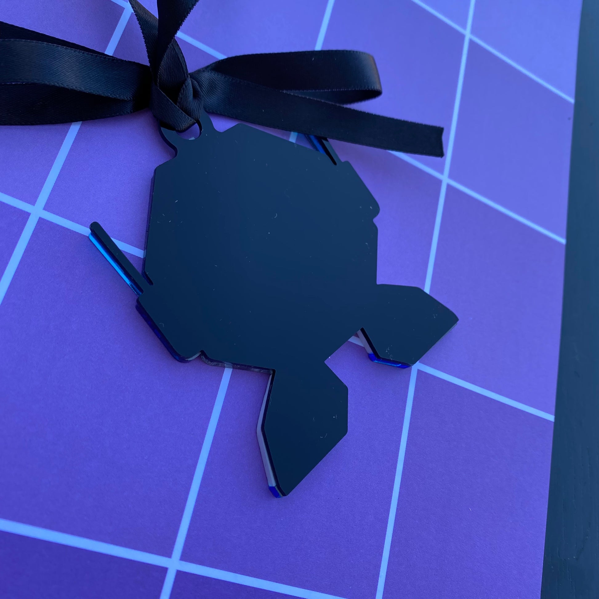 The ornament is cut and etched from my own laser! The back is a plain black acrylic