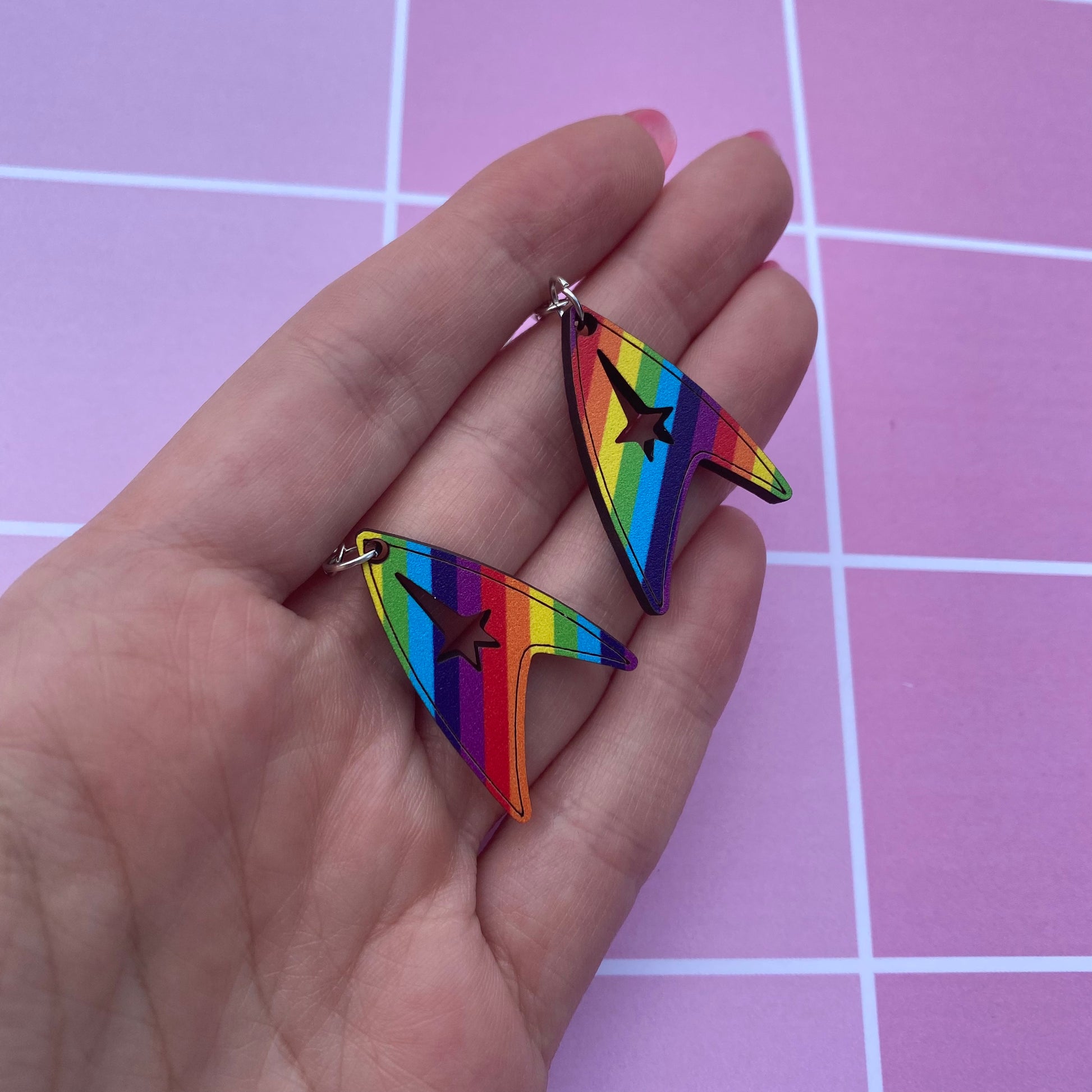 The earrings are 1.2”, and cut from a rainbow printed wood! They’re extra lightweight and hang from nickel-free silver hooks!!