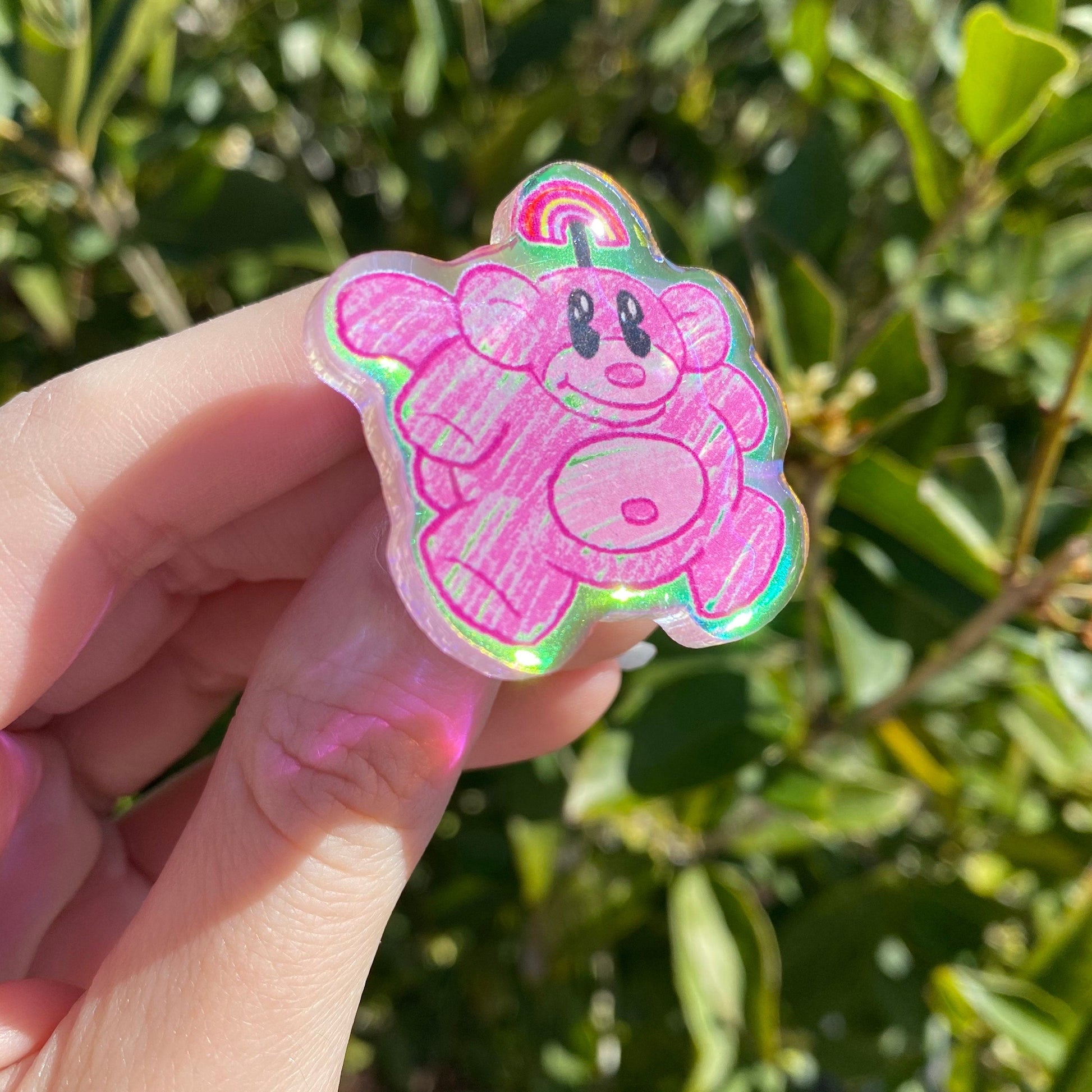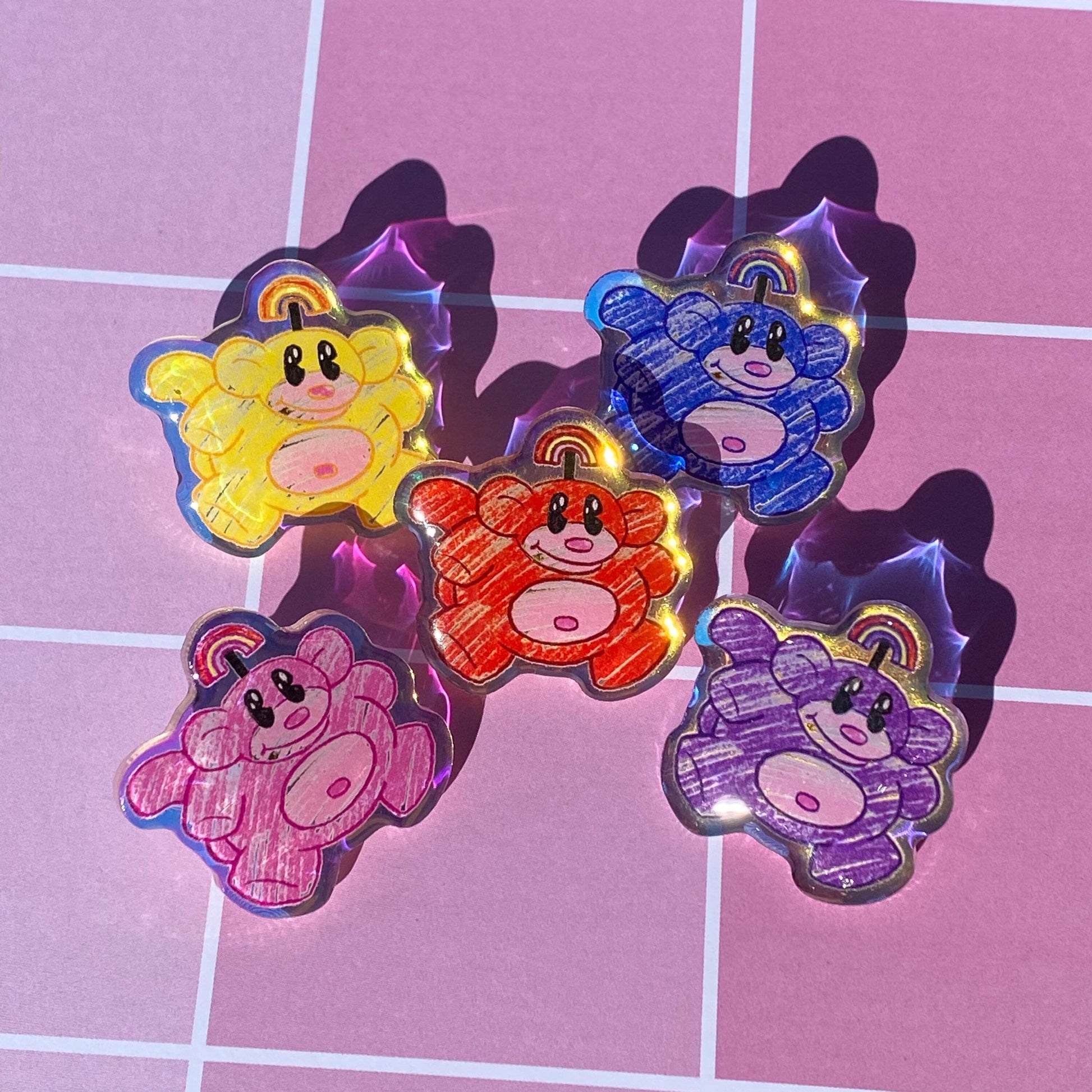 The pins are 1.5”, on rainbow iridescent acrylic, with a thick epoxy coating to protect the image!