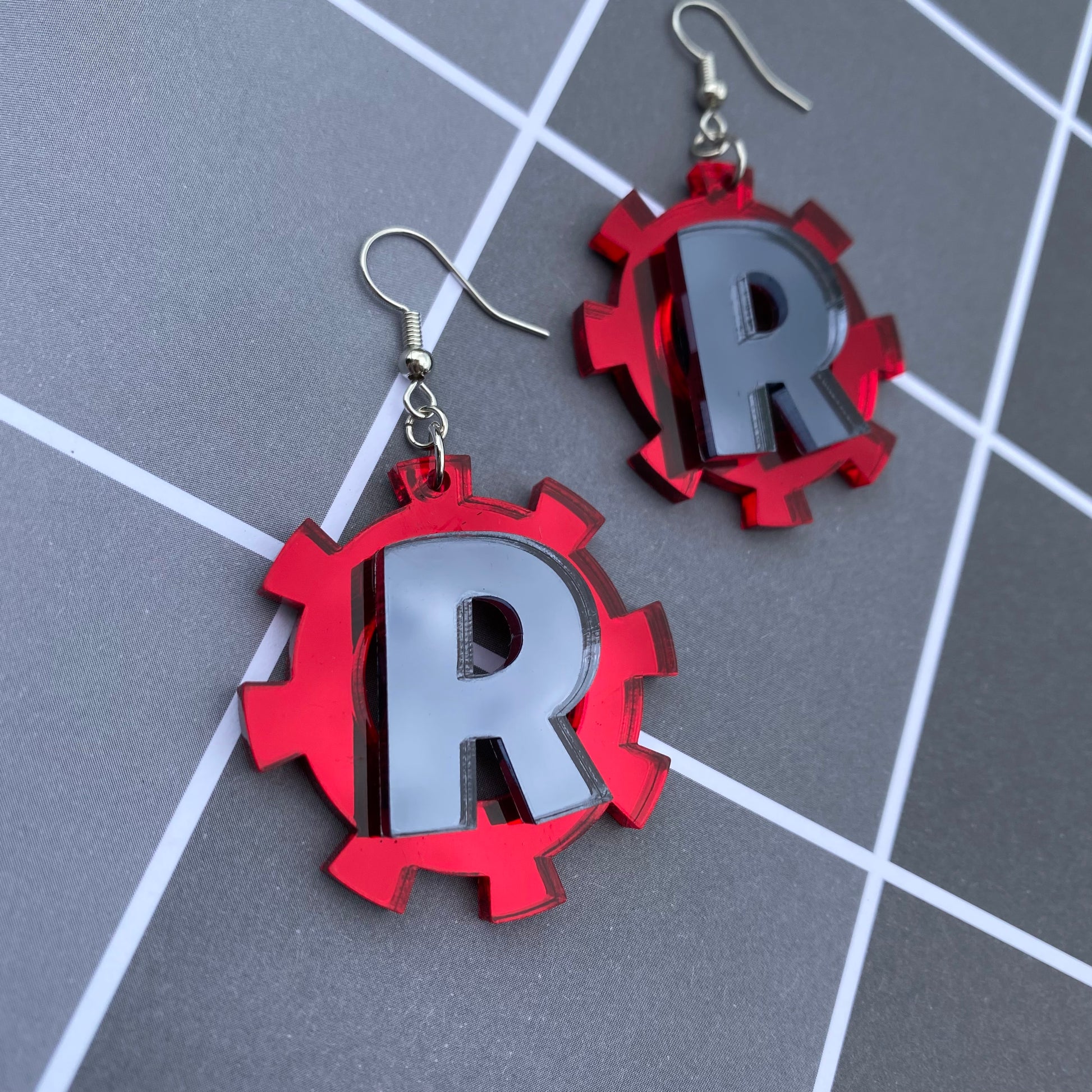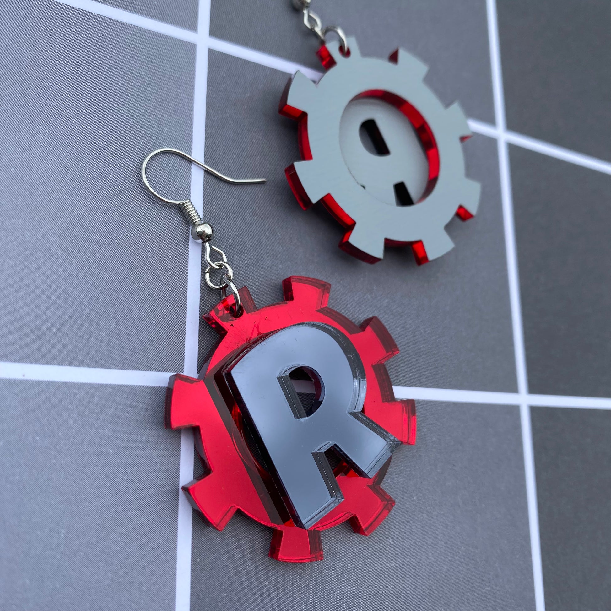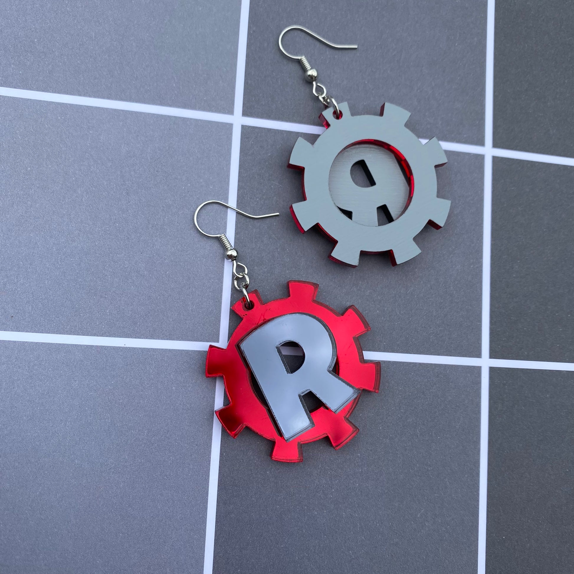 The earrings are 1.5” in diameter, and cut from my own laser! The earrings feature two different mirrored acrylic- where the backside is a light grey color.