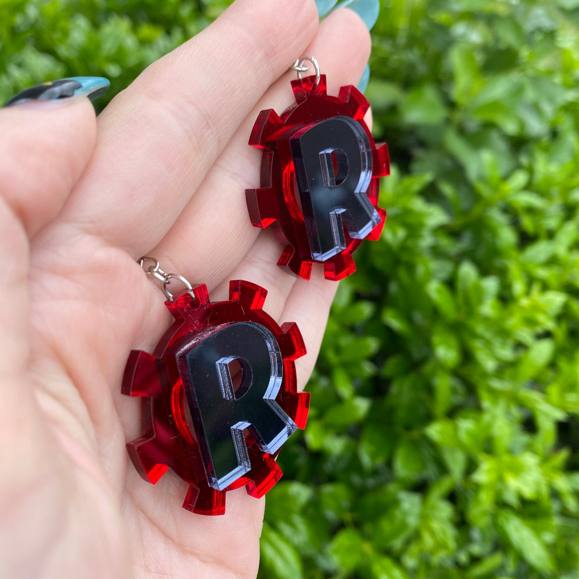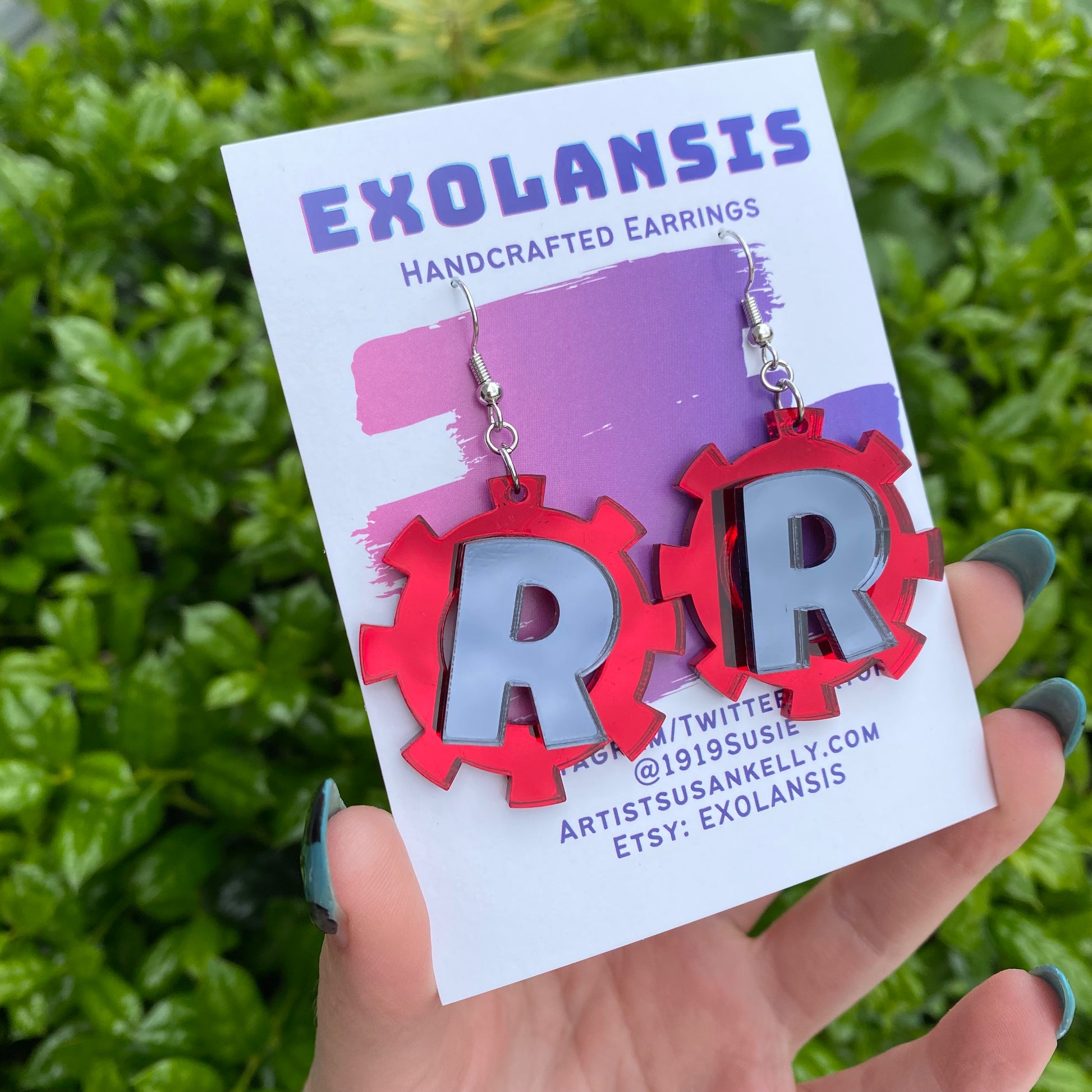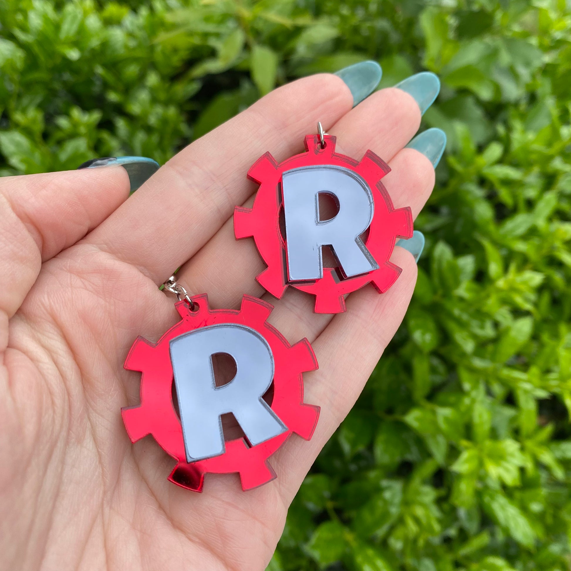 The earrings are 1.5” in diameter, and cut from my own laser! The earrings feature two different mirrored acrylic- where the backside is a light grey color.