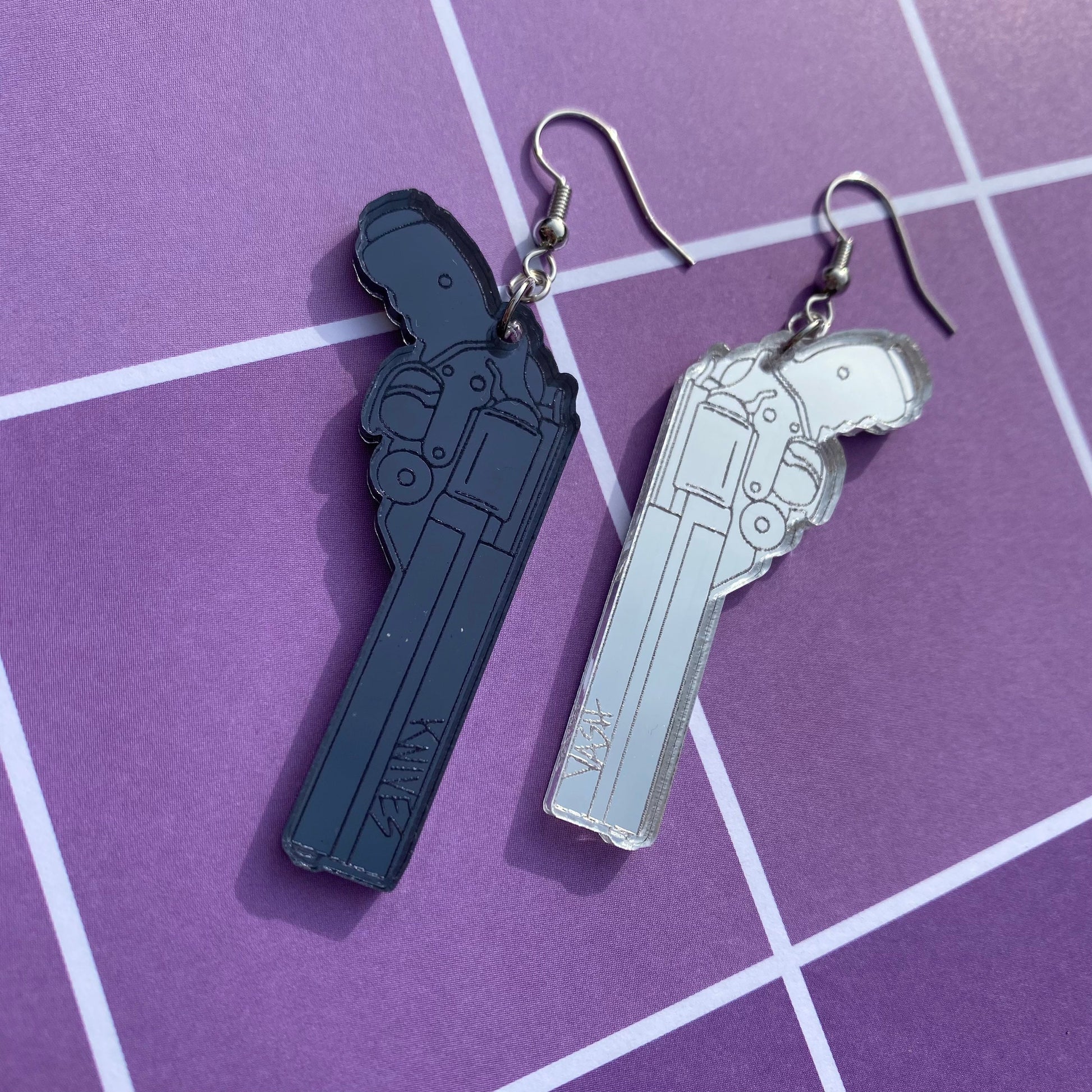 I always plan on catching up to more recent animes— but I somehow always end up rewatching Trigun. Inspired by our favorite humanoid typhoon and his .. malicious brother- this pair of earrings features their go-to matching weapons with their names etched into the barrel.