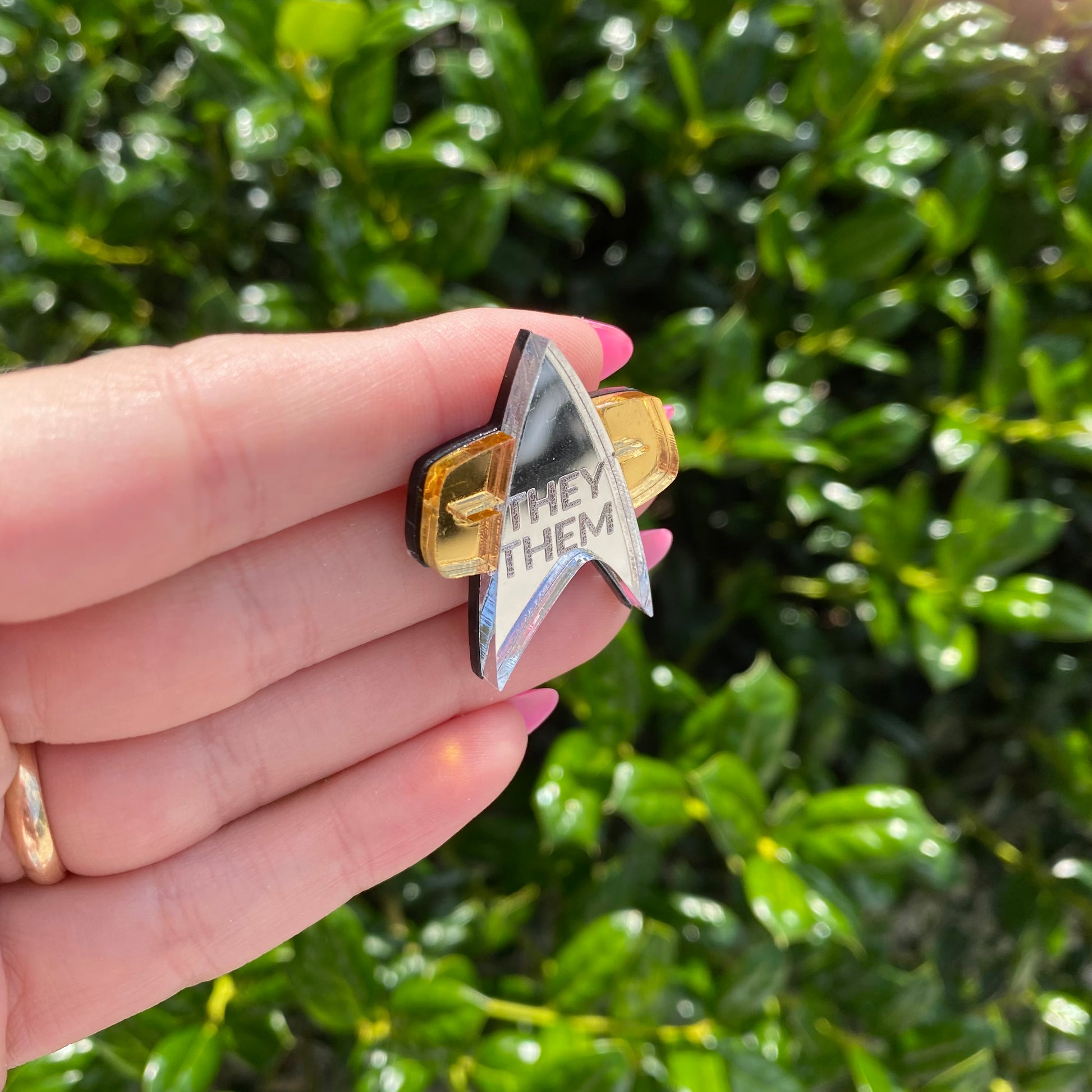 Each pin is cut and engraved from mirror acrylic- they’re super shiny and eye catching!!
