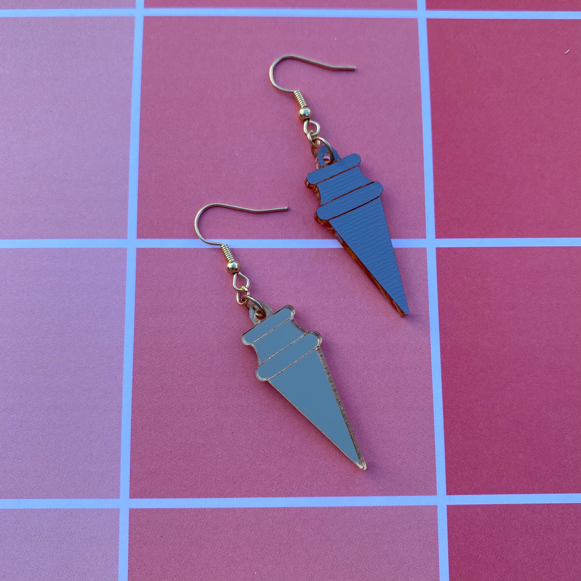 The earrings are 1.5” long and cut from my own laser! The earrings are etched from mirror backed acrylic, meaning the front is shiny and the back is a light grey color!